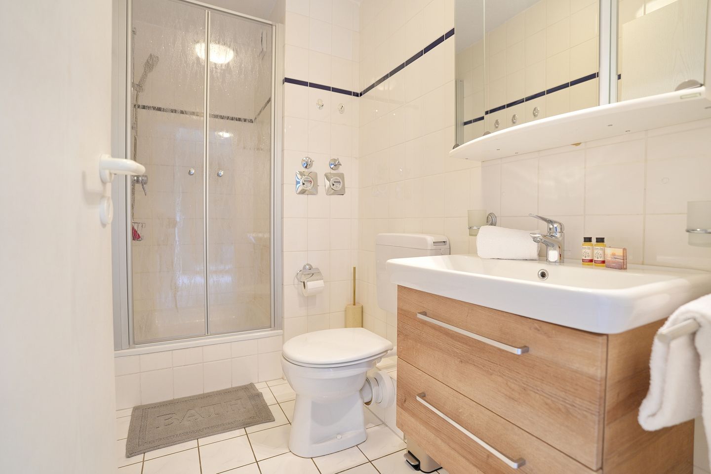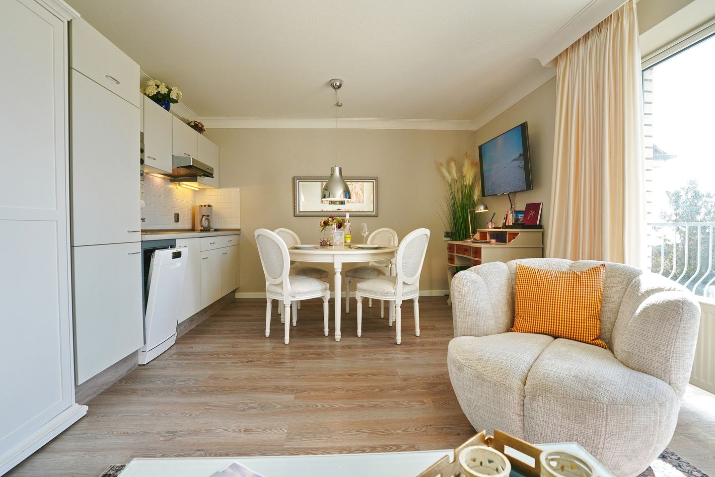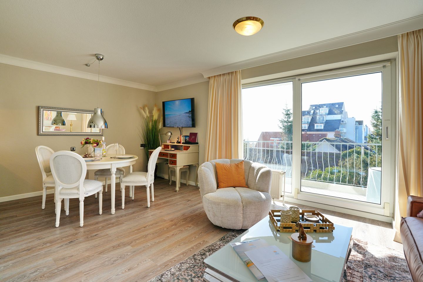 Sie bietet im Wohnschlafraum unter anderem ein komfortables Schlafsofa(1,40 x 2,00m), ein drehbarer Sessel, Küchenzeile mit Ceranfeld, Spülmaschine und Mikrowelle, Essecke, TV und Blue-Ray Player und Balkon zur Südostseite mit seitlichem Meerblick. Das Schlafzimmer ist mit einem Doppelbett(1,80 x 2,00 m) mit Topper und anliegendem Balkon zur Ostseite ausgestattet. Das Duschbad verfügt über einen Föhn.