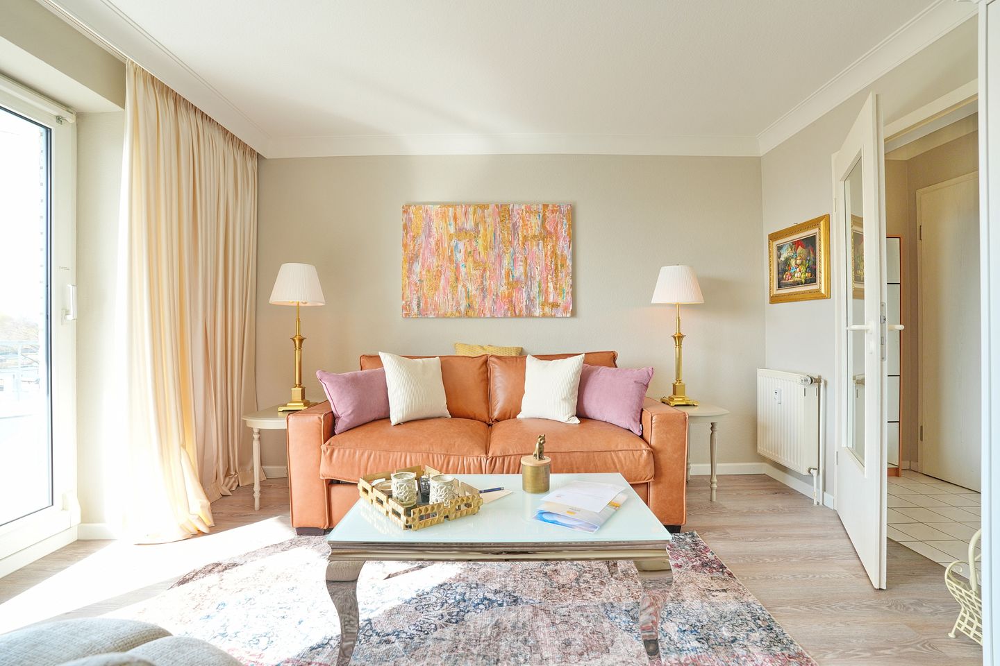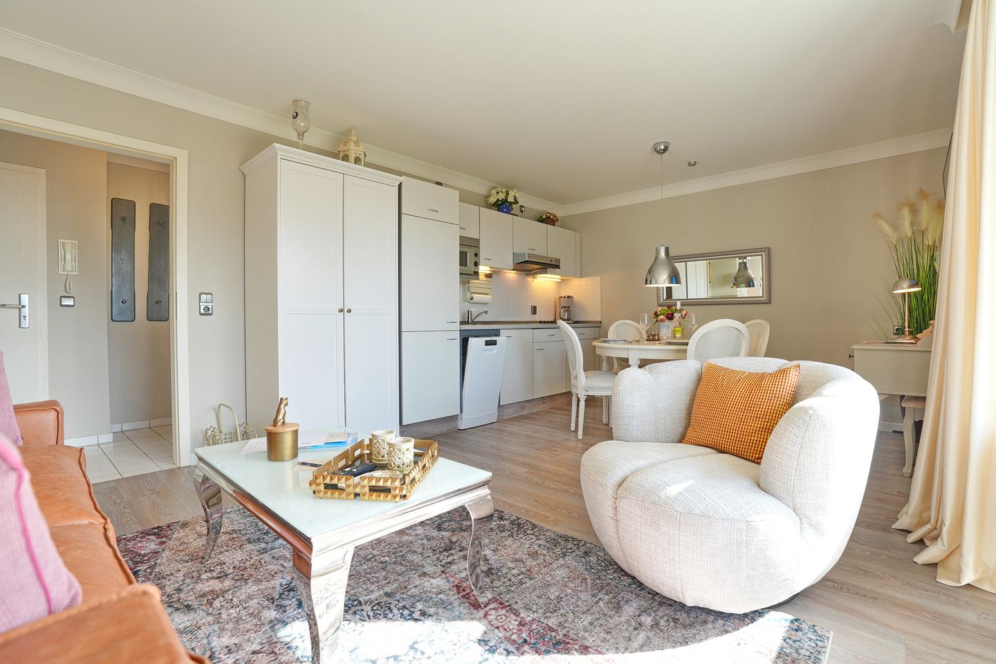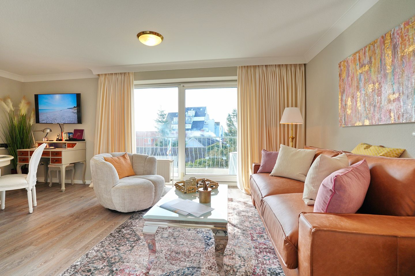 Sie bietet im Wohnschlafraum unter anderem ein komfortables Schlafsofa(1,40 x 2,00m), ein drehbarer Sessel, Küchenzeile mit Ceranfeld, Spülmaschine und Mikrowelle, Essecke, TV und Blue-Ray Player und Balkon zur Südostseite mit seitlichem Meerblick. Das Schlafzimmer ist mit einem Doppelbett(1,80 x 2,00 m) mit Topper und anliegendem Balkon zur Ostseite ausgestattet. Das Duschbad verfügt über einen Föhn.