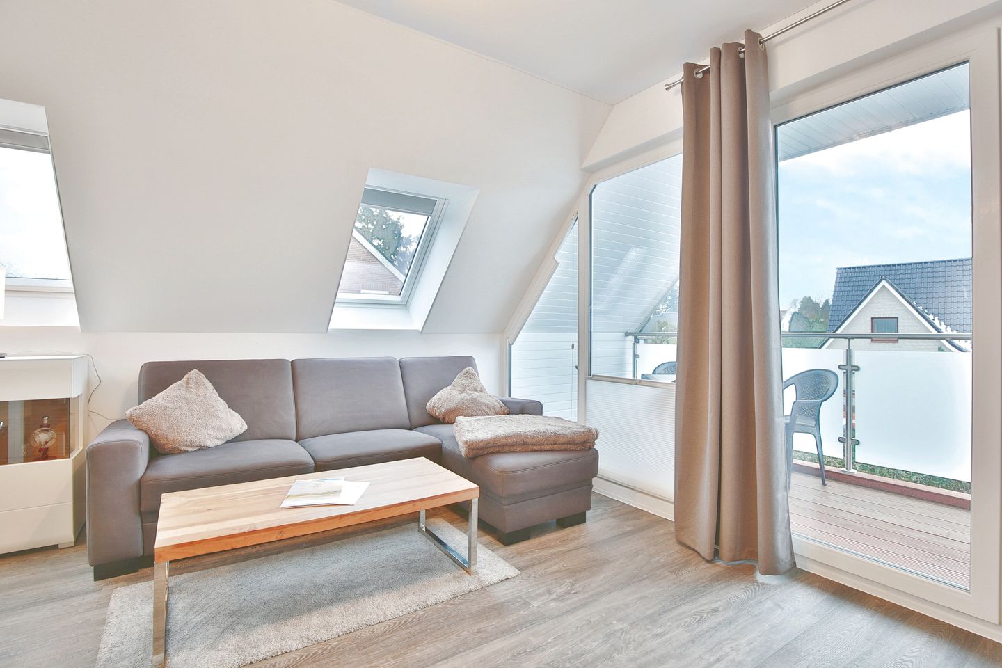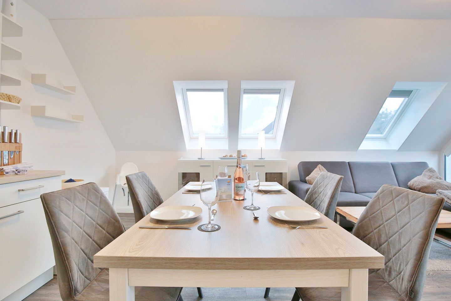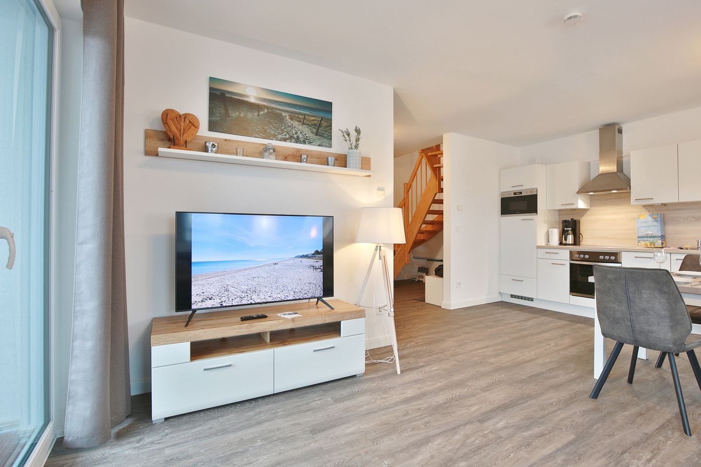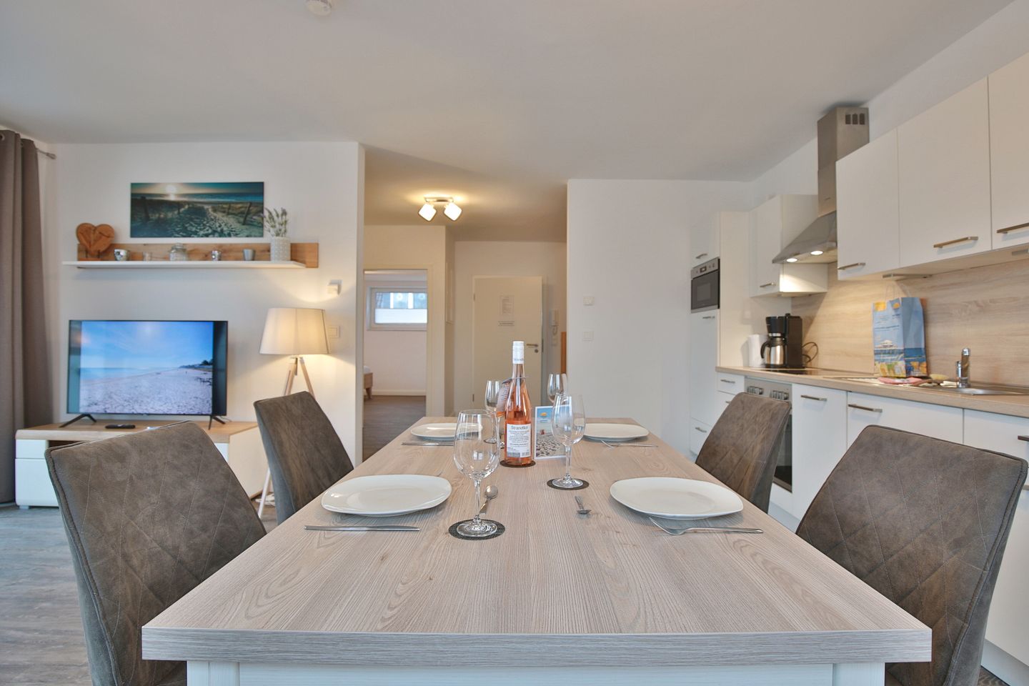 Der große und offene Wohn- und Küchenbereich verfügt über eine bequeme Couch, auf der Sie gemütlich abends entspannt Ihre liebsten Serien & Filme schauen können. Der Essplatz für 4 Personen lädt zum gemeinsamen Frühstück bei viel Licht am Morgen ein. Die vollausgestattete Küche verfügt über einen Geschirrspüler, 4-Felder-Cerankochfeld, Backofen, Filterkaffeemaschine, Toaster, Kühlschrank und extra Gefrierschrank. Über das Wohnzimmer kommen Sie auf den überdachten Balkon. Ebenfalls können Sie die kleine Terrasse vor den Parkplätzen am Haus mit nutzen.