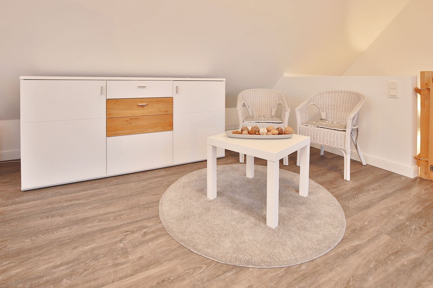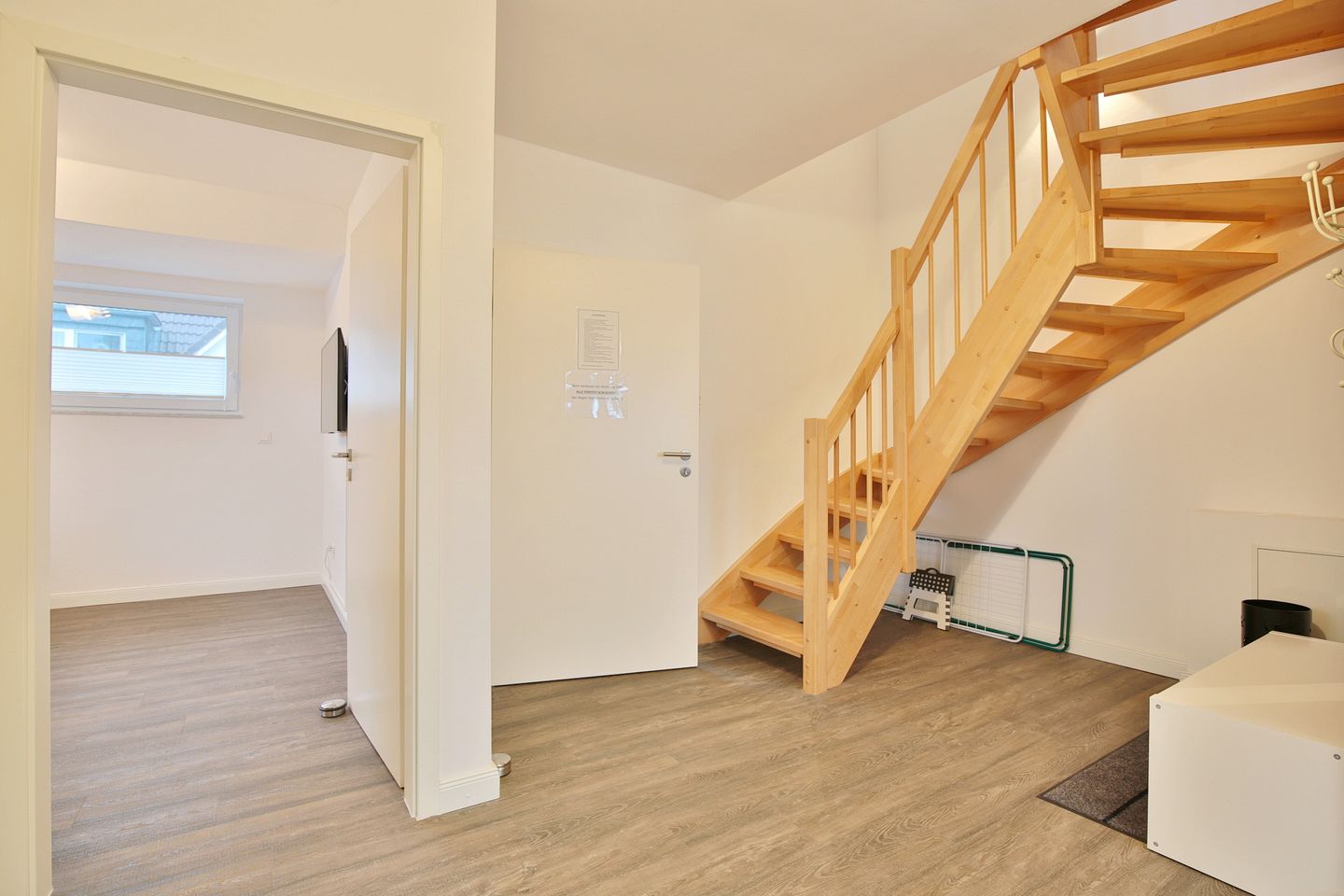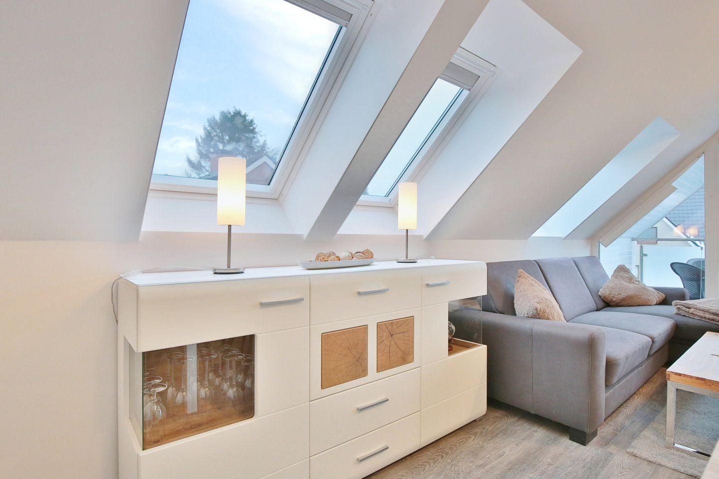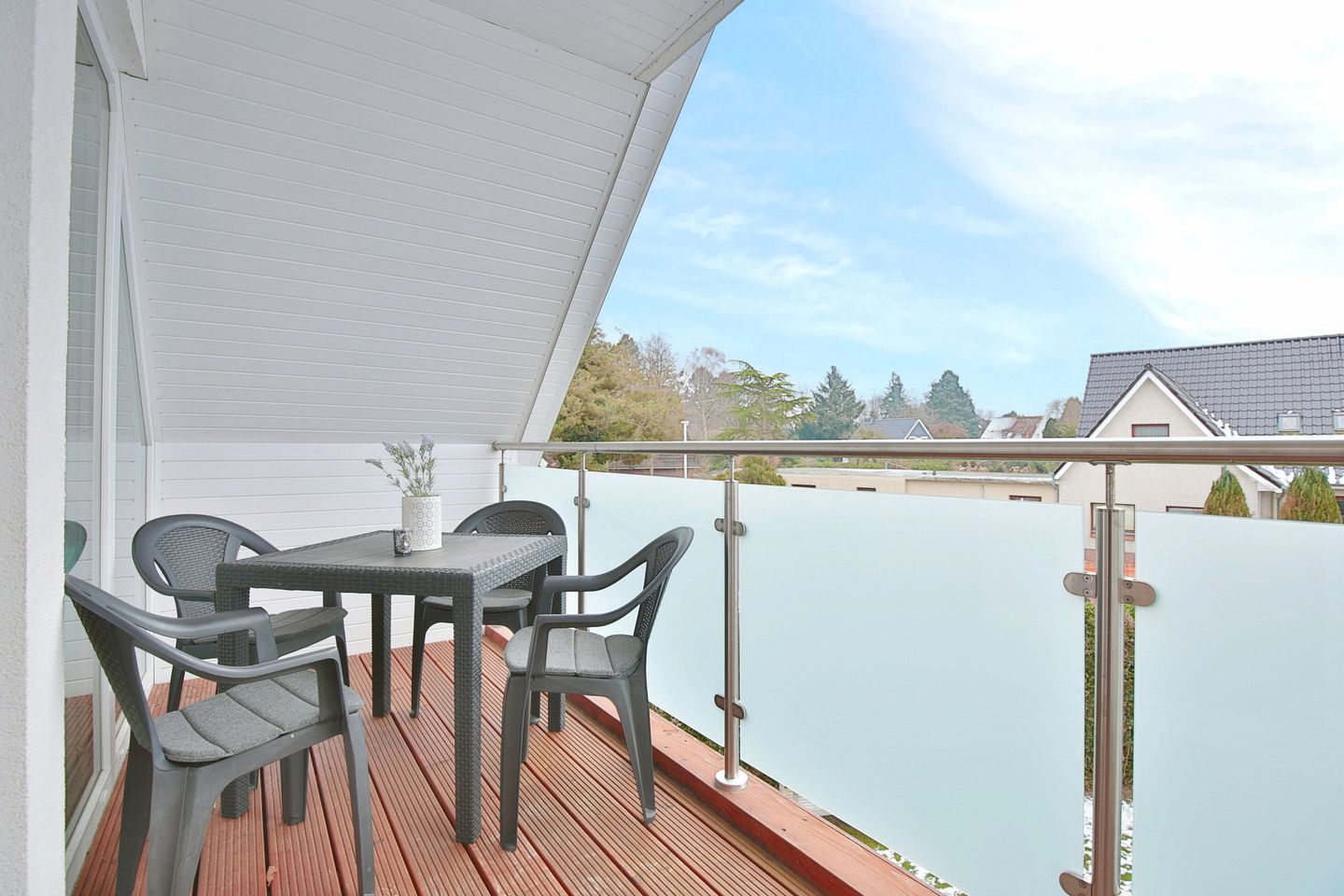 Der große und offene Wohn- und Küchenbereich verfügt über eine bequeme Couch, auf der Sie gemütlich abends entspannt Ihre liebsten Serien & Filme schauen können. Der Essplatz für 4 Personen lädt zum gemeinsamen Frühstück bei viel Licht am Morgen ein. Die vollausgestattete Küche verfügt über einen Geschirrspüler, 4-Felder-Cerankochfeld, Backofen, Filterkaffeemaschine, Toaster, Kühlschrank und extra Gefrierschrank. Über das Wohnzimmer kommen Sie auf den überdachten Balkon. Ebenfalls können Sie die kleine Terrasse vor den Parkplätzen am Haus mit nutzen.
