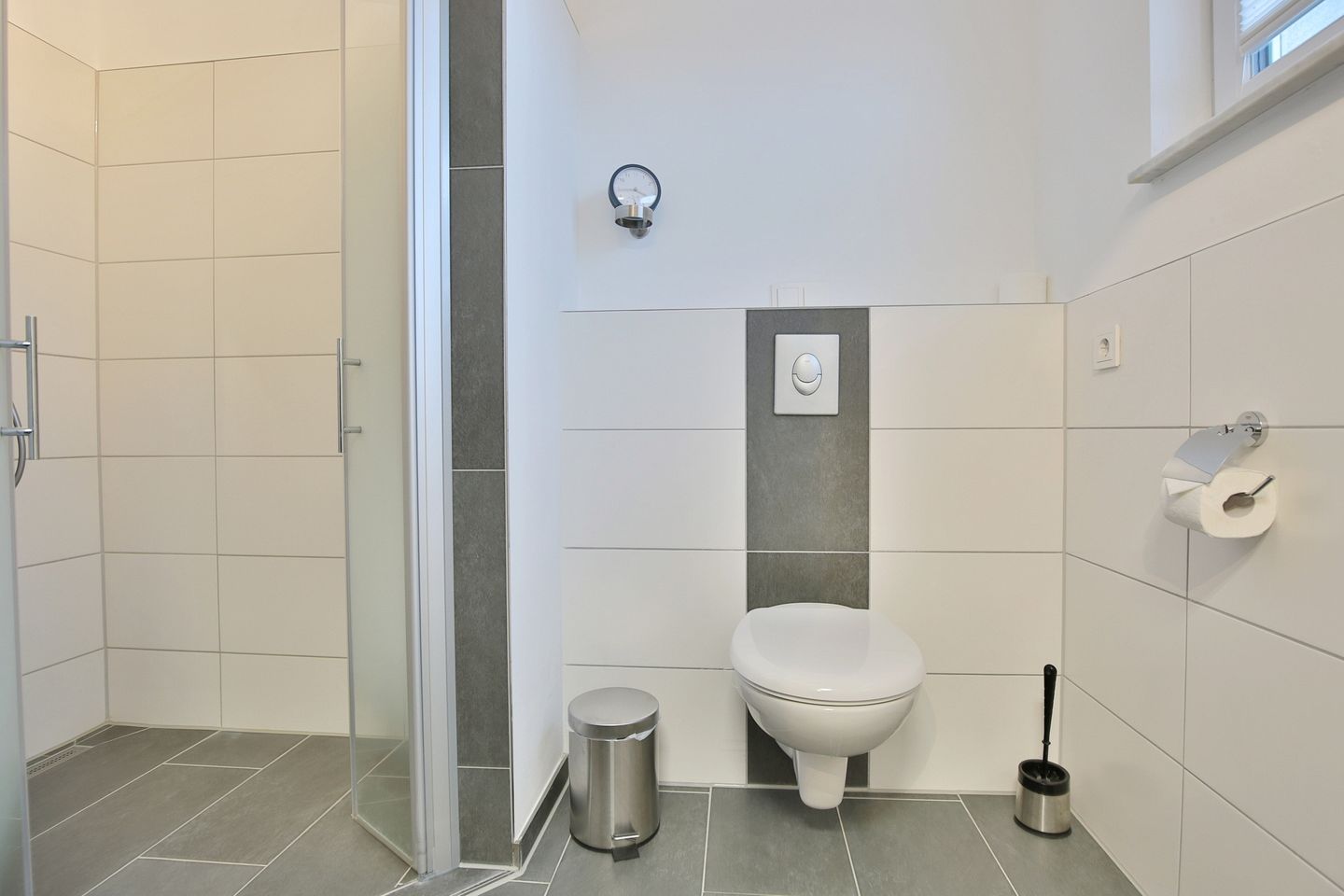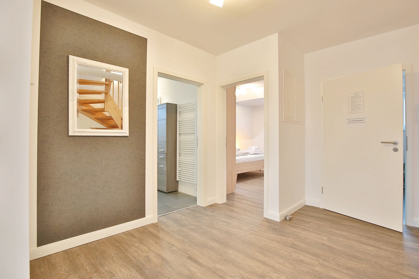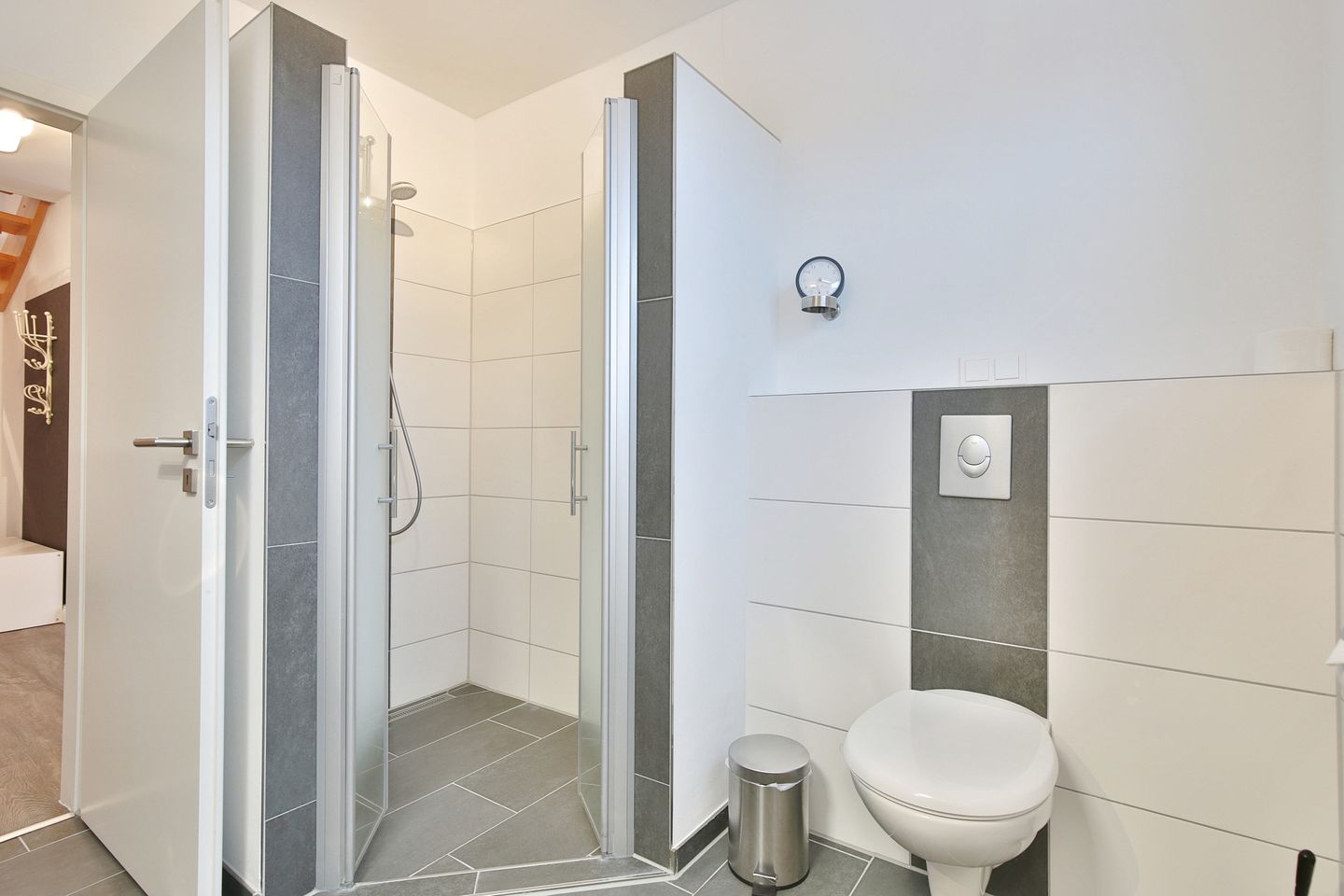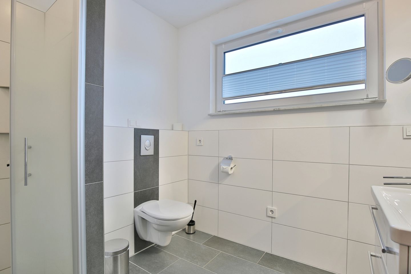 Das moderne Bad mit WC und Waschtisch verfügt über eine komfortable, ebenerdige Dusche, sowie über einen Handtuchtrockner und einen Kosmetikspiegel.
