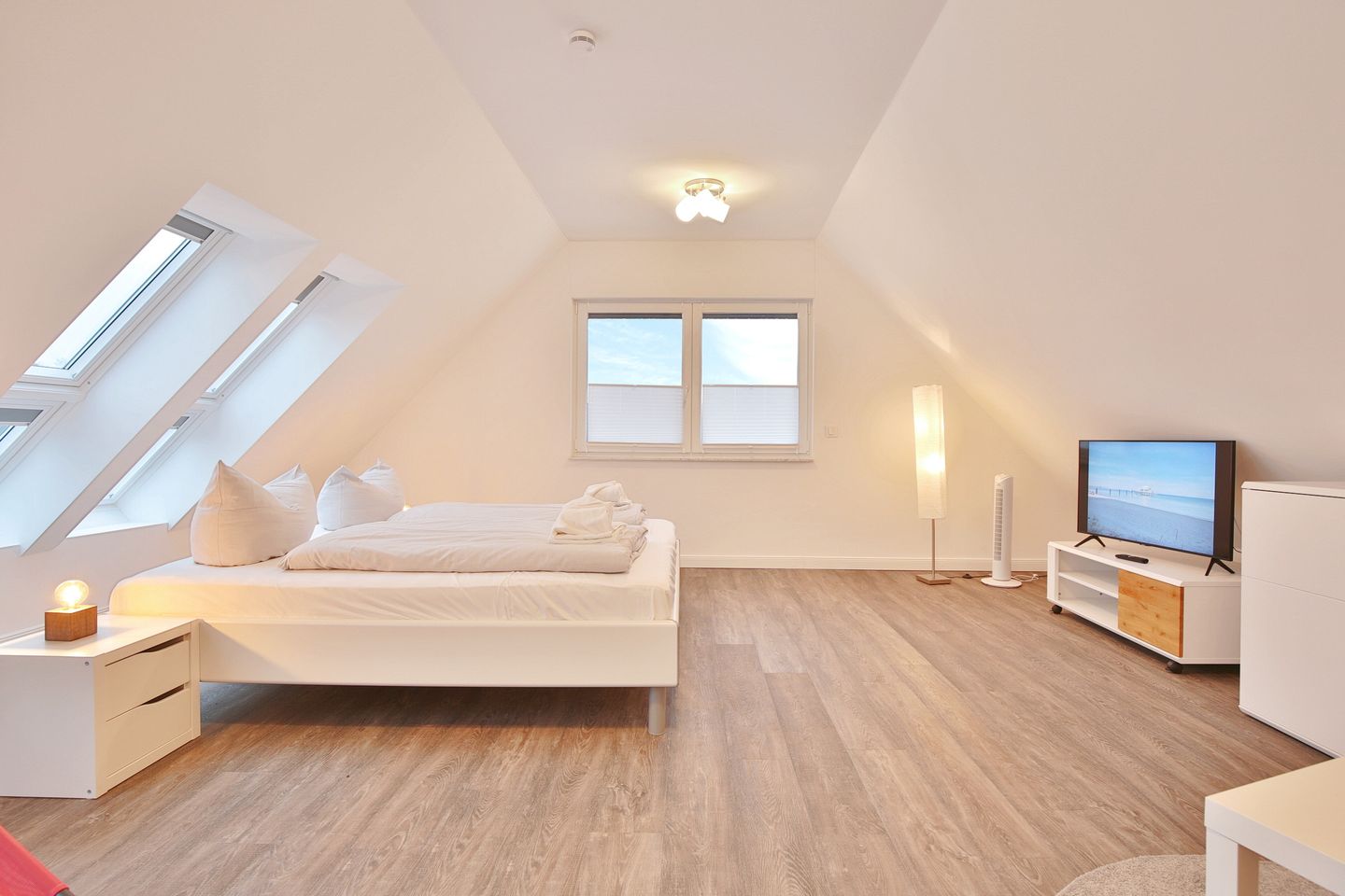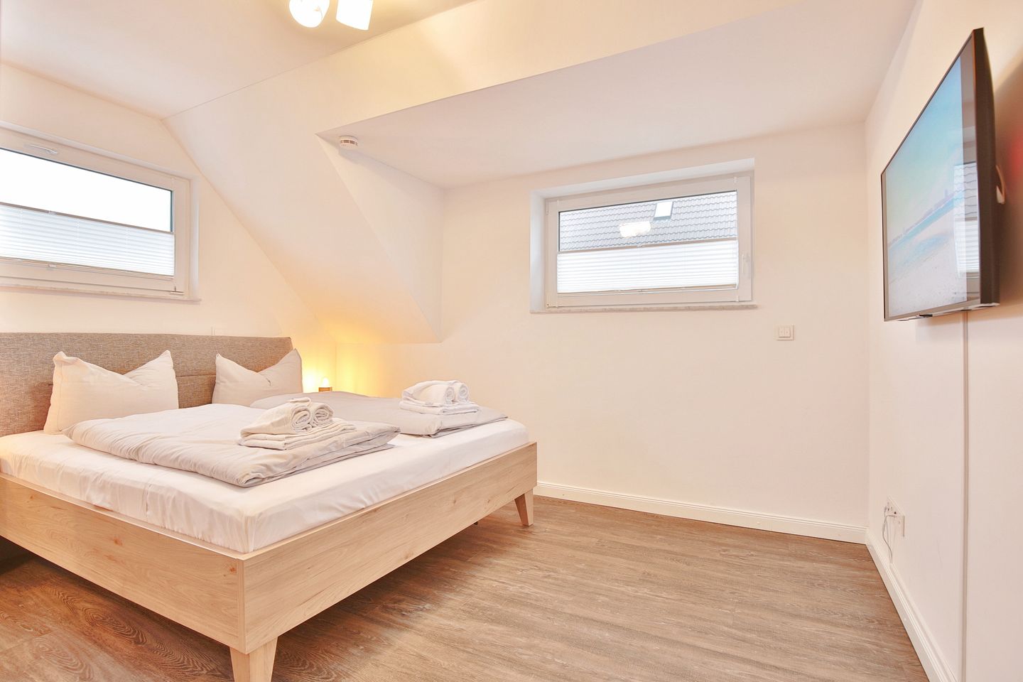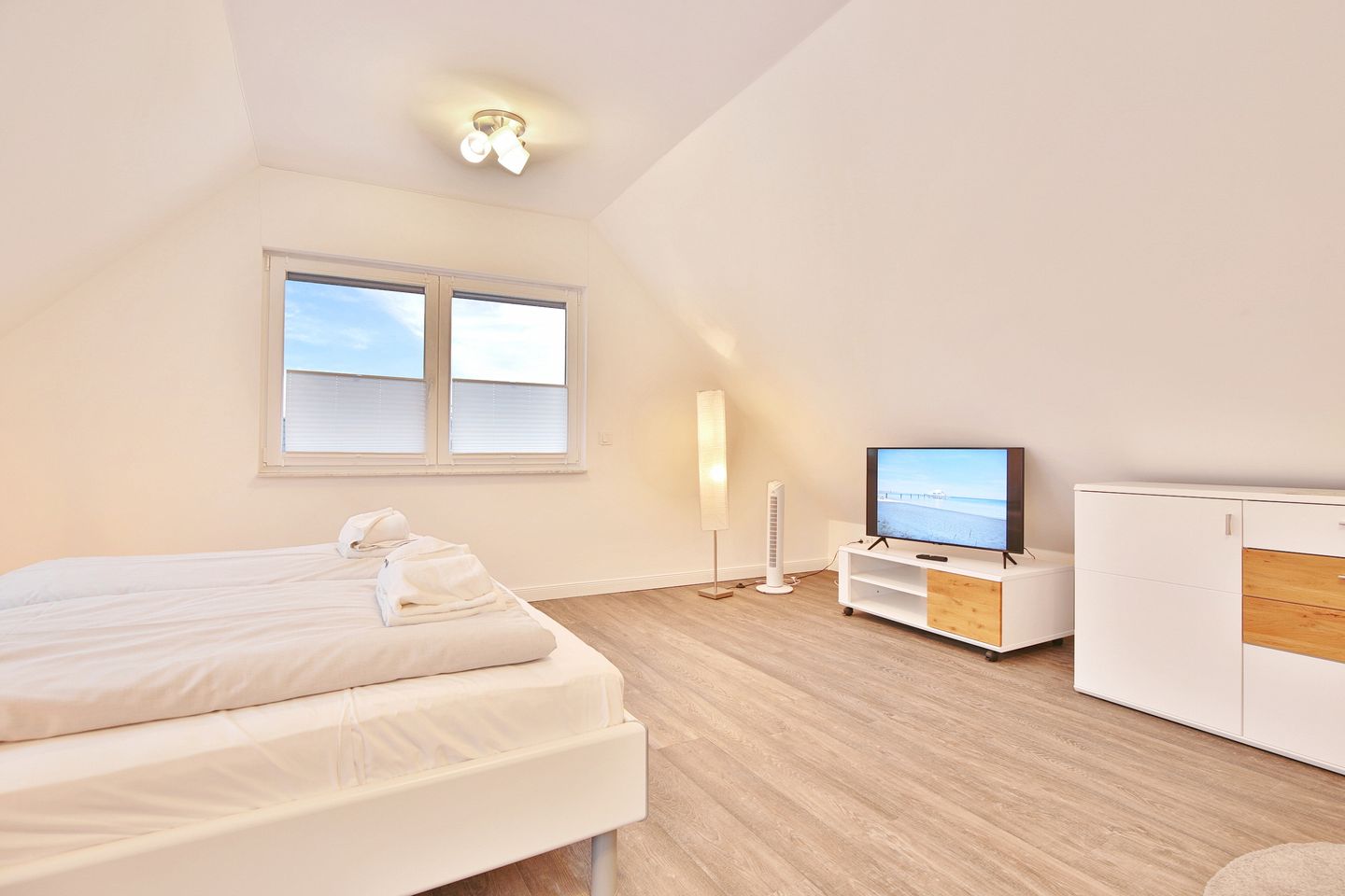 Im unteren Schlafzimmer finden Sie ein gemütliches Doppelbett (1,80 x 2,00m) vor, welches zum erholsamen Schlaf einlädt. Im dazugehörigen Kleiderschrank ist genug Platz, um all Ihre Kleidung unterzubringen. Ebenfalls verfügt das Schlafzimmer über einen eigenen TV.