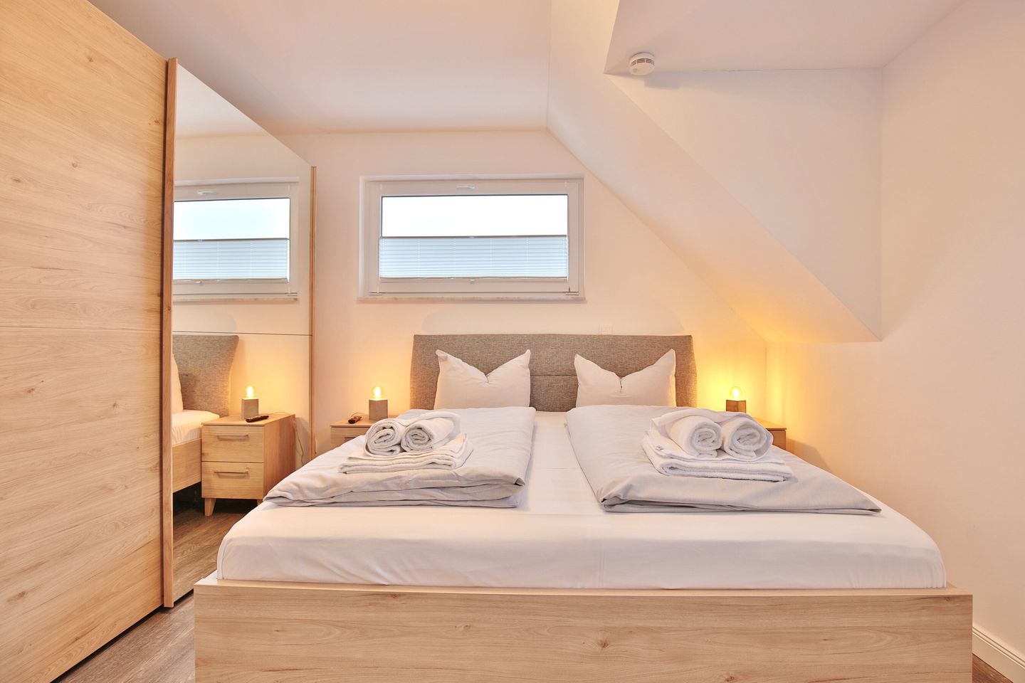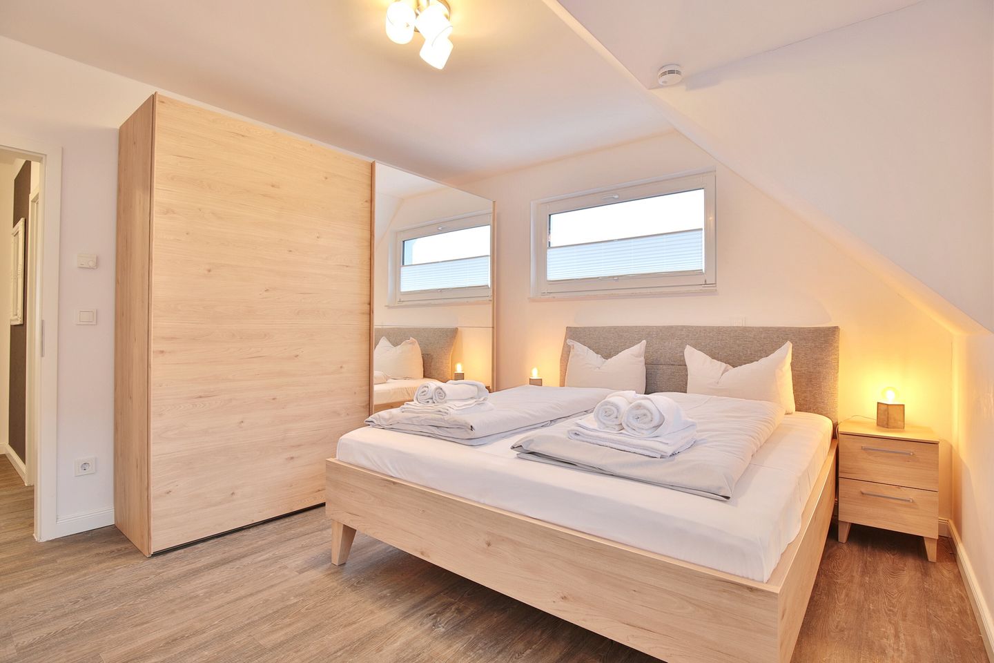 Das geräumige 2. Schlafzimmer, welches im oberen Stockweck liegt und nur über eine Treppe zu erreichen ist, verfügt über ein gemütliches Doppelbett (1,80 x 2,00), eine Kommode, TV und eine kleine Sitzecke. Des Weiteren befindet sich der Zugang zur eigenen kleinen Sauna über das Zimmer. Hier können Sie in Ihrer eignen kleinen Wellnessoase entspannen.