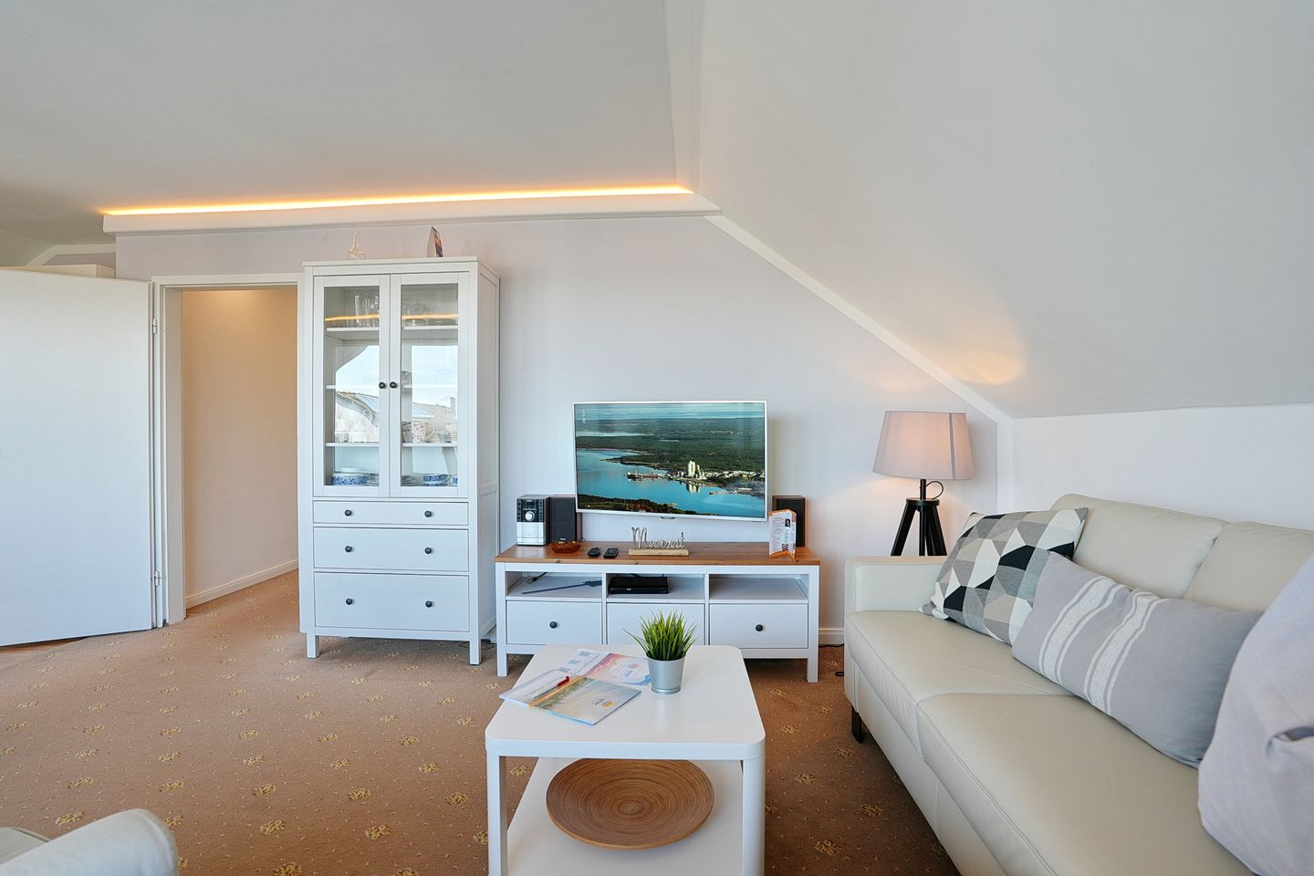 Der Wohnzimmer ist mit einem Eck.- / Schlafsofa aus Leder für 1 Person, einem Sessel, Fernseher, DVD-Player, Essplatz für 4 Personen und mit einer indirekten Beleuchtung, die kuschelige Abende, zum Highlight des Tages macht.