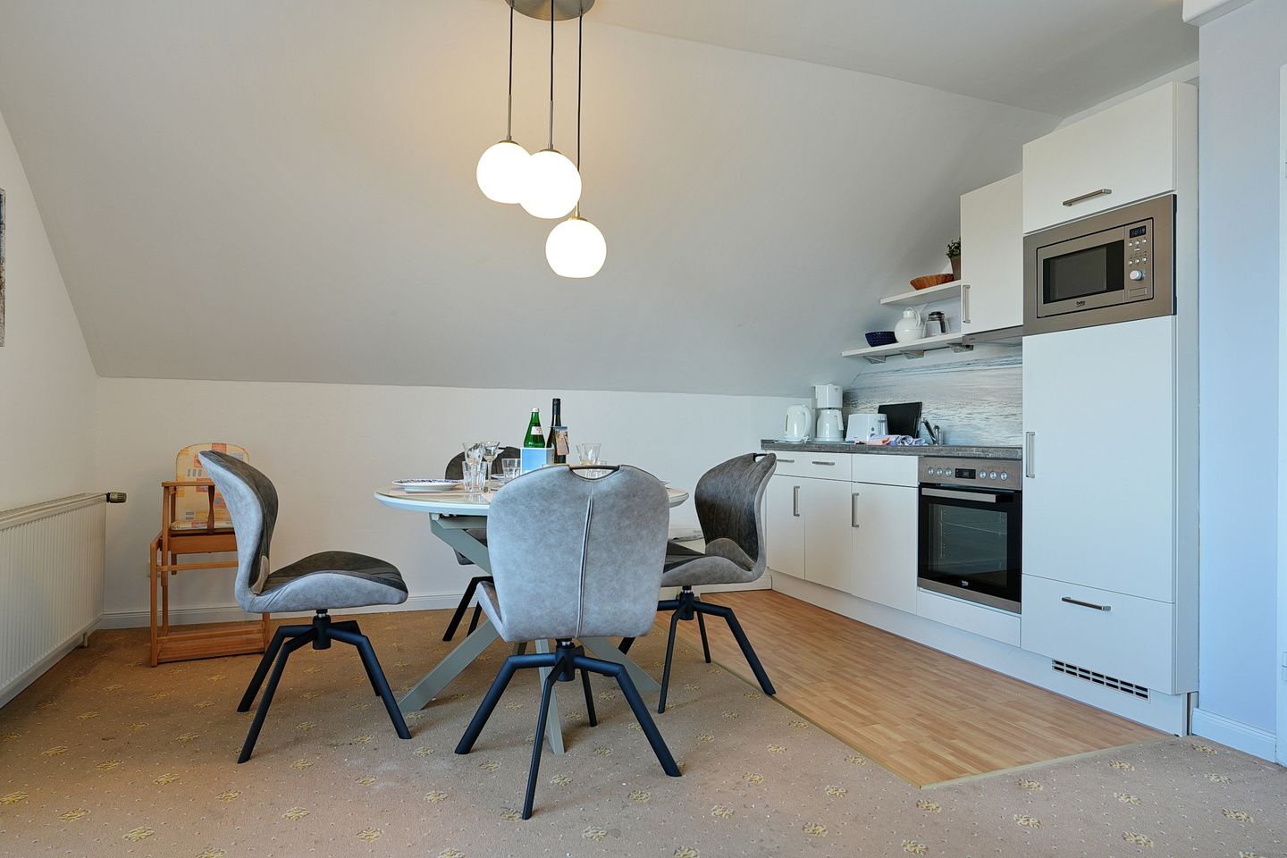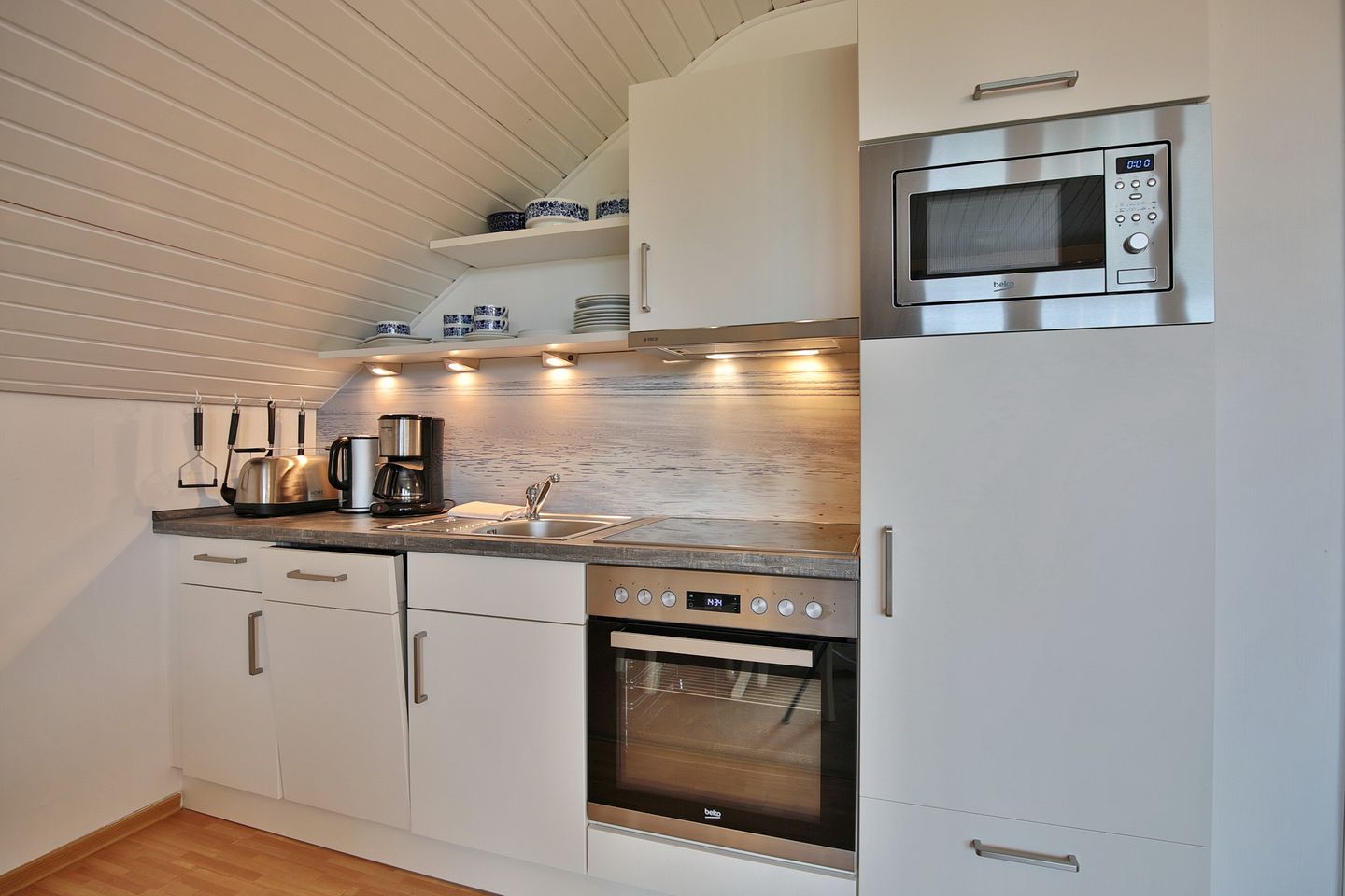 Die offene Küchenzeile ist mit Backofen, Mikrowelle, Kühlschrank mit Tiefkühlfach, Geschirrspülmaschine, Kaffeemaschine, Wasserkocher und Toaster ausgestattet.