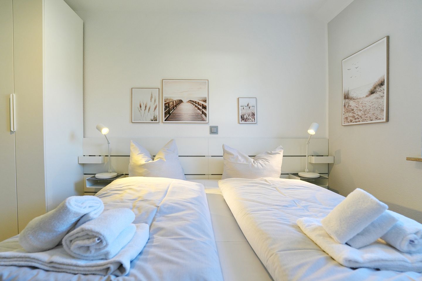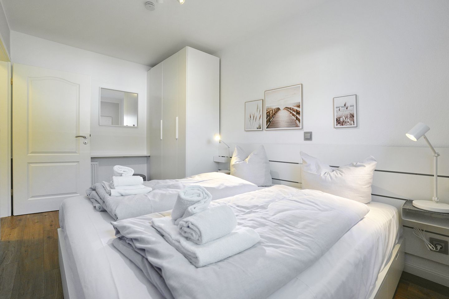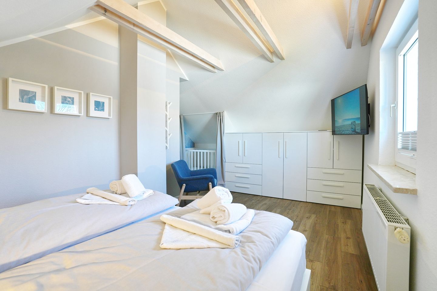 Ein weiteres Schlafzimmer verfügt über zwei Einzelbetten (1,00m x 2,00m) und einen LCD Fernseher. Ein Kinderbett und ein Hochstuhl stehen in der Wohnung zur Verfügung.