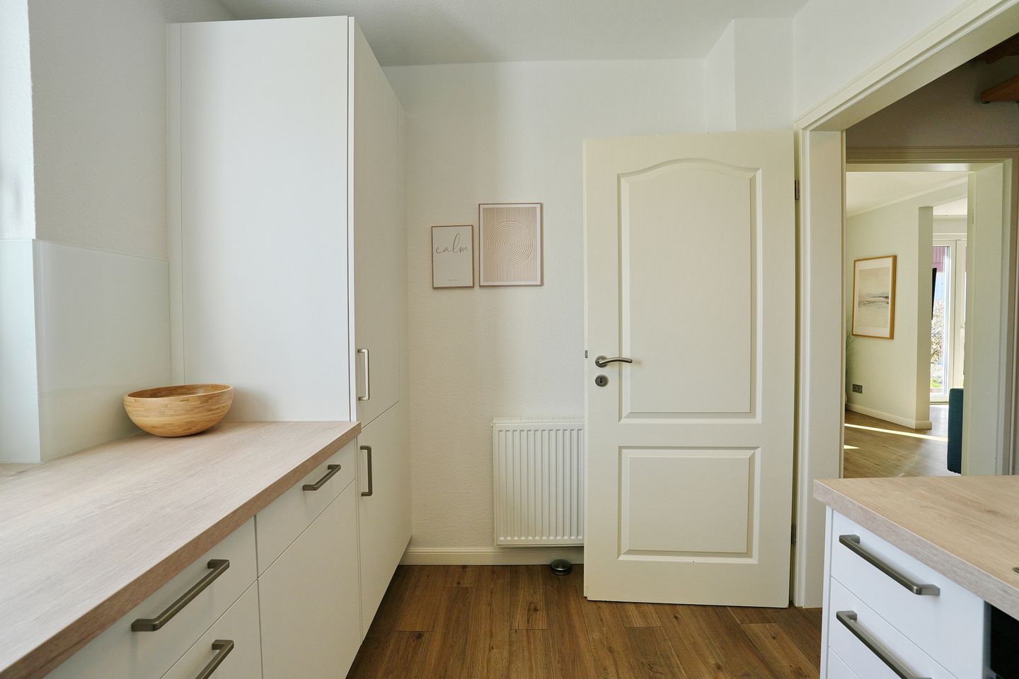 Die separate Bosch-Küchenzeile verfügt über einen Herd mit Cerankochfeld, einen Backofen, einen Kühl- und Gefrierschrank, eine Spülmaschine, eine Mikrowelle, eine Kaffeemaschine, einen Toaster, einen Wasserkocher und diverses Kleininventar, welches die Ausstattung komplettiert. In der Küche befindet sich ebenfalls ein Waschtrockner, der für Sie kostenfrei zur Verfügung steht (kostenfrei).
