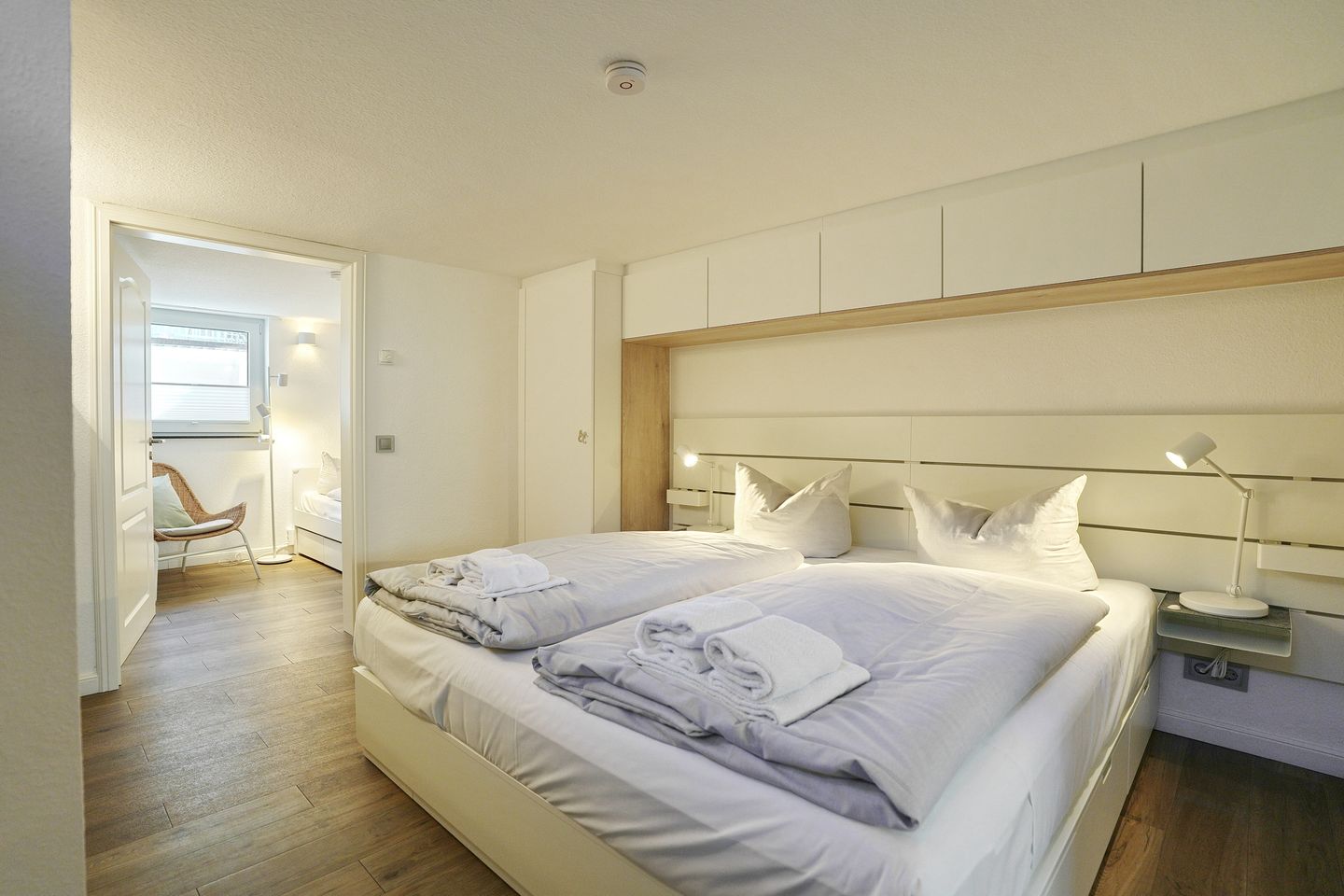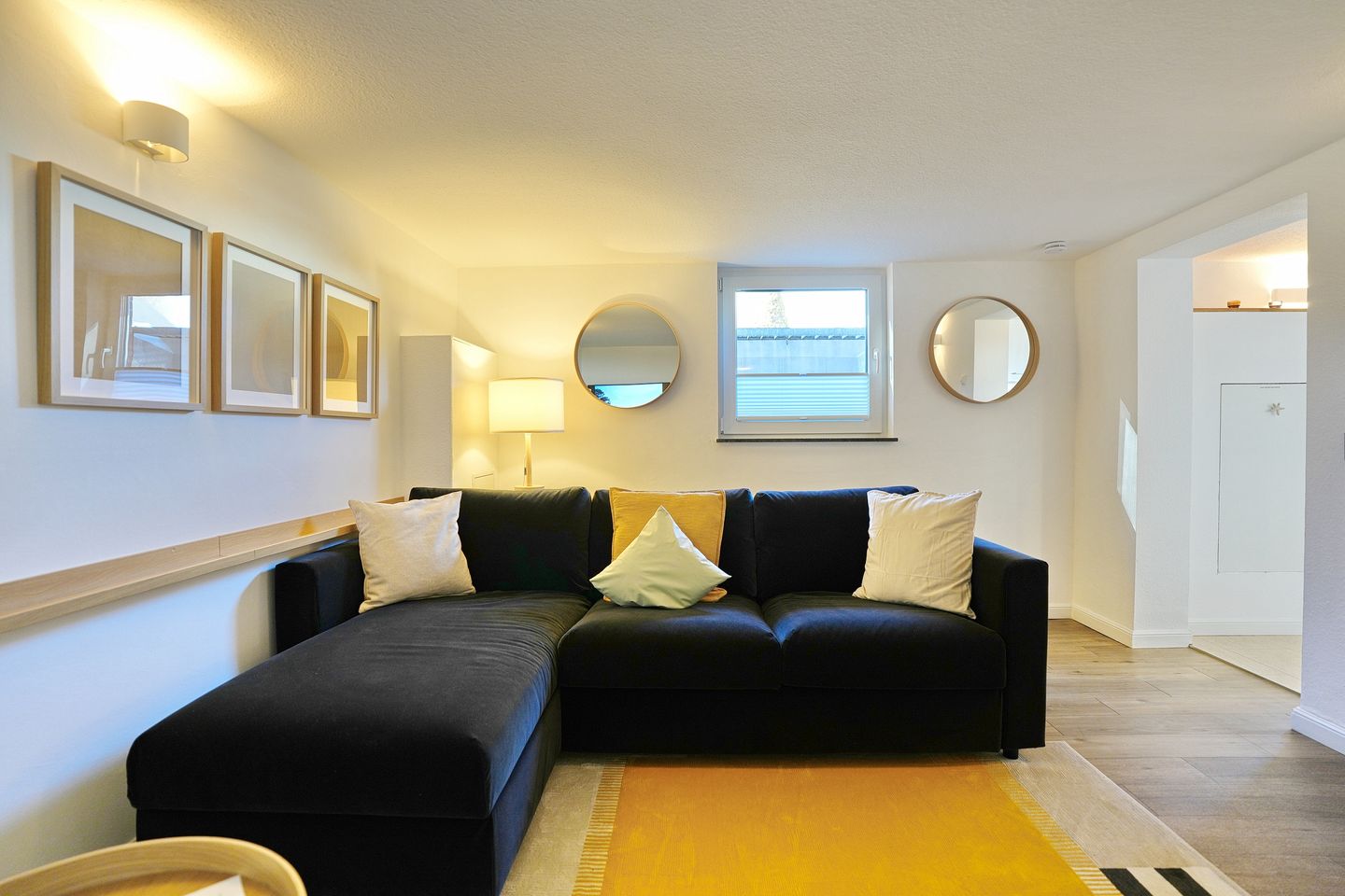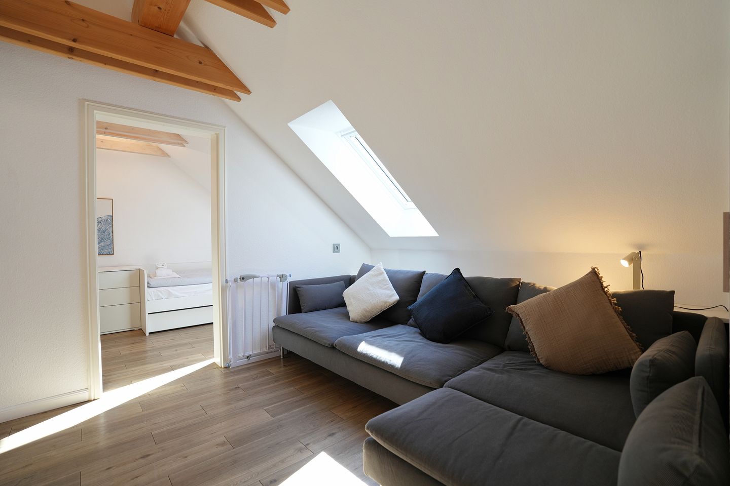 Im Untergeschoss (separater Eingang, keine Verbindungstür vom Haus) befindet sich ein individuelles und geräumiges 2,5-Zimmer Appartement (58 m²) mit eigener Sauna (kostenfrei). Das Wohnzimmer mit Flatscreen-TV lädt zum Verweilen ein. Der Schlafraum ist mit einem Doppelbett ausgestattet. Von dort aus gelangen Sie durch eine Tür in ein zweites kleines Schlafzimmer, das mit einem Einzelbett ausgestattet ist.