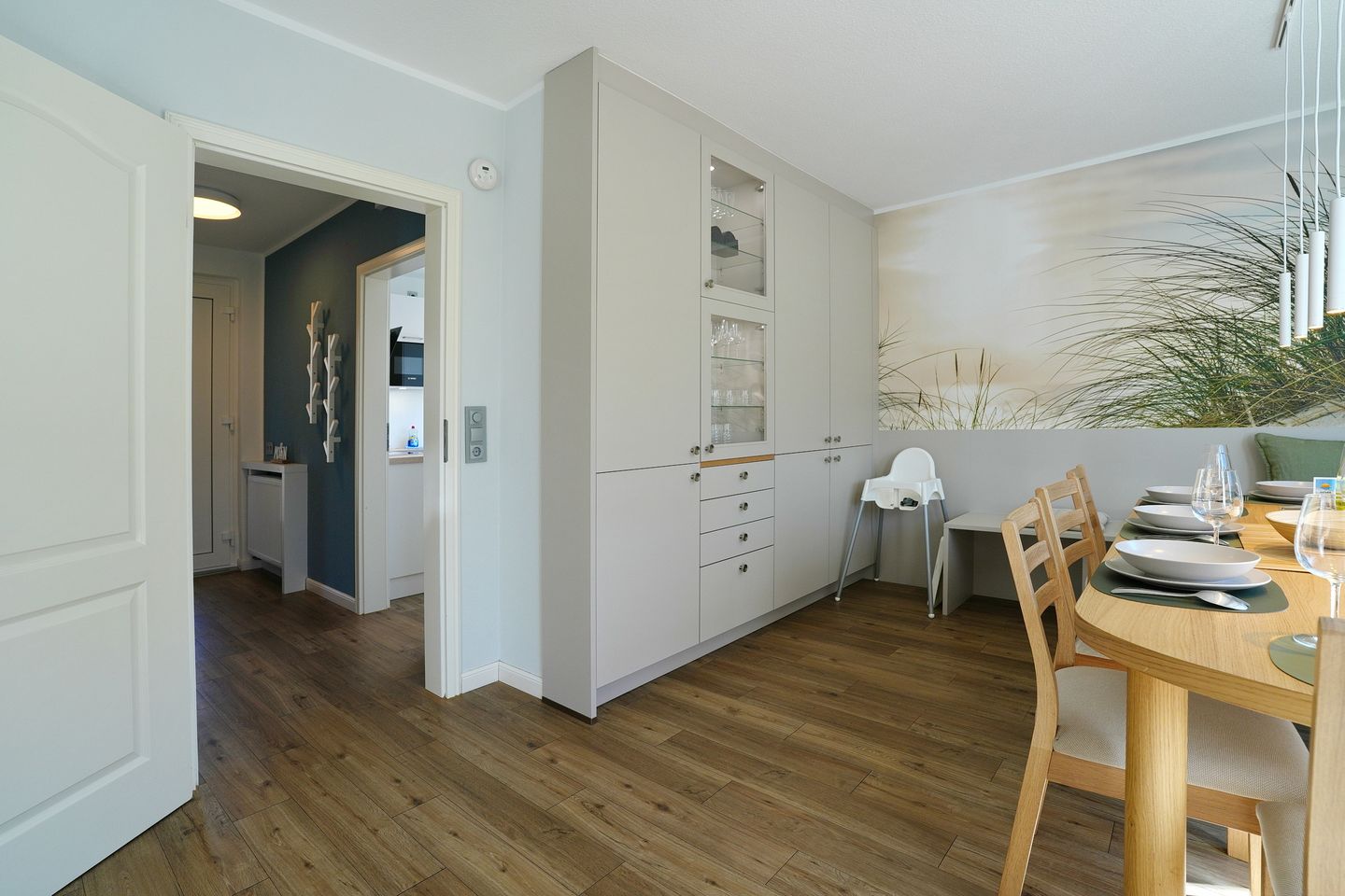 Das geräumige und lichtdurchflutete Wohnzimmer mit angrenzendem Esszimmer ist gemütlich eingerichtet und verfügt über eine großzügige Südwestterrasse mit Sonnenliegen und Sitzgruppe zur Südseite, sodass Sie vom Mittag bis zum Abend die Sonne genießen können.