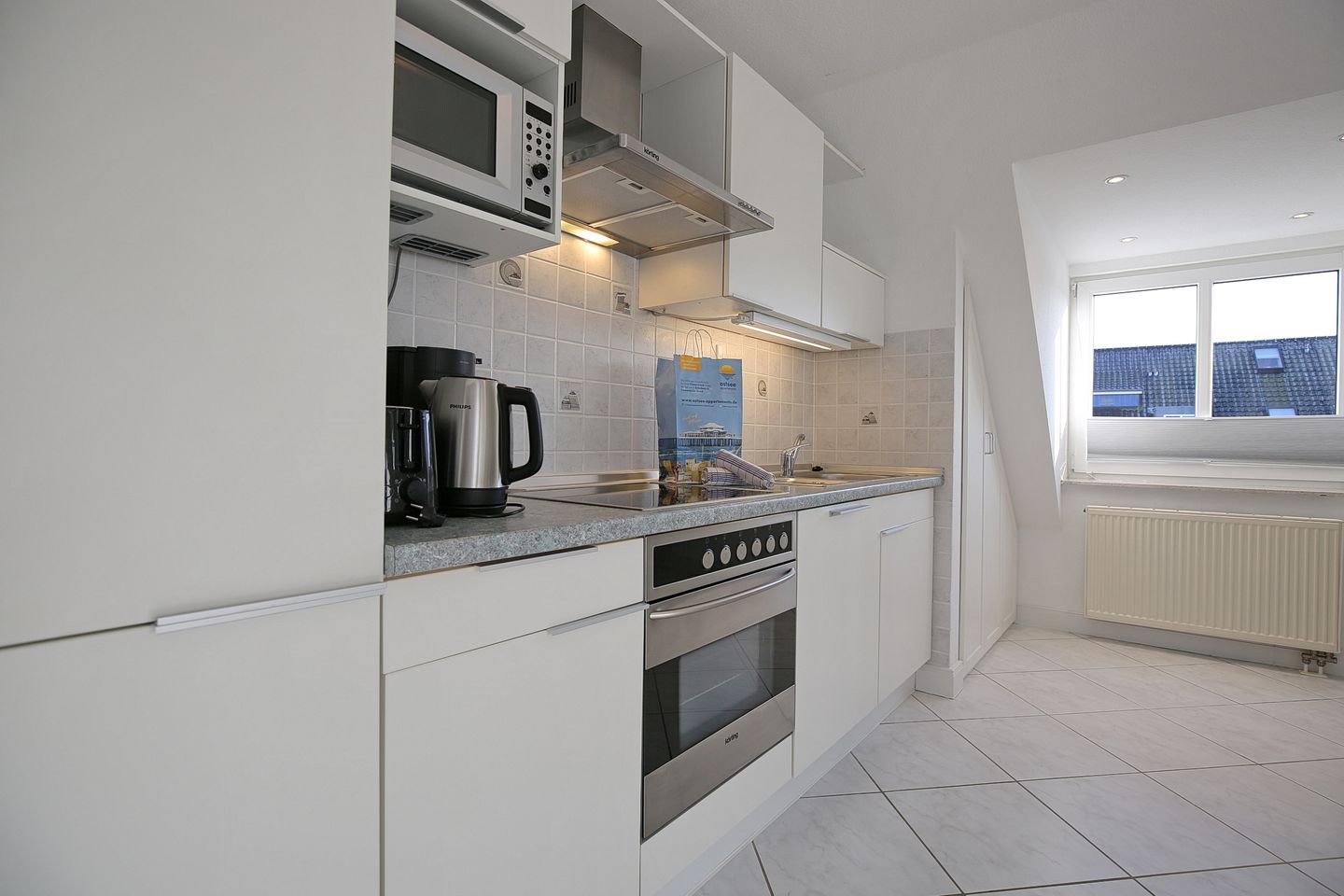 Die offene Küche ist mit einem Backofen, Kühlschrank mit Gefrierfach, Mikrowelle, Spülmaschine, Kaffeemaschine, Wasserkocher und Toaster ausgestattet. Der Essplatz bietet Sitzgelegenheit für 2 Personen, an welchen Sie gemütlich frühstücken können.