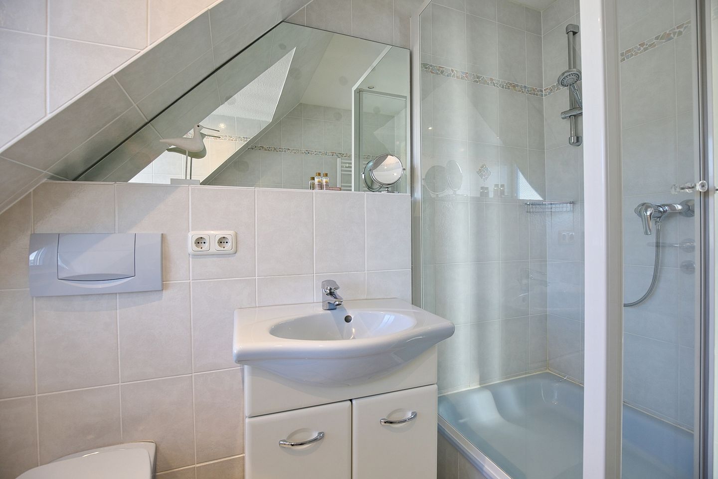 Das Badezimmer im unteren Bereich ist mit einer Dusche und einem Kosmetikspiegel und Föhn ausgestattet.