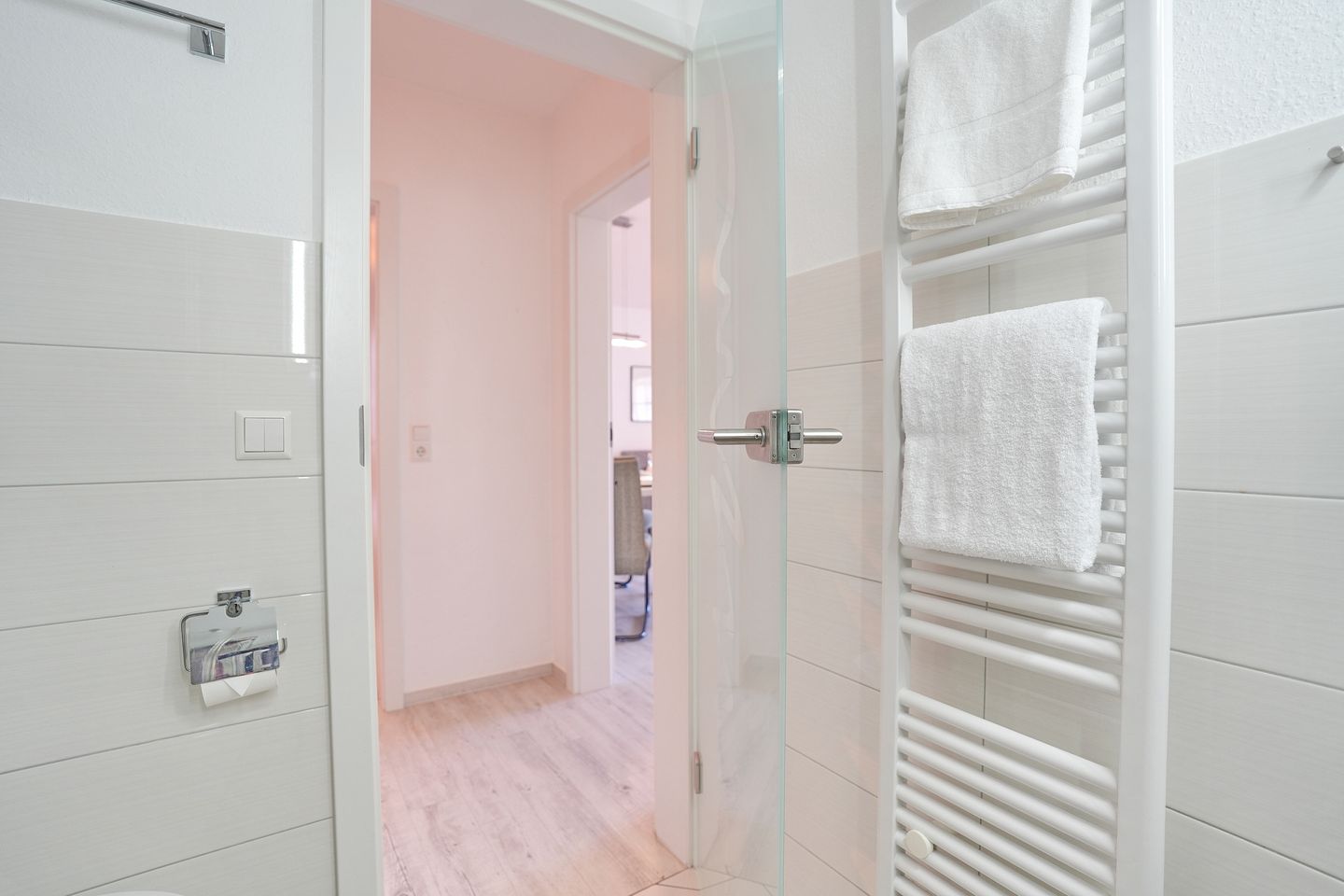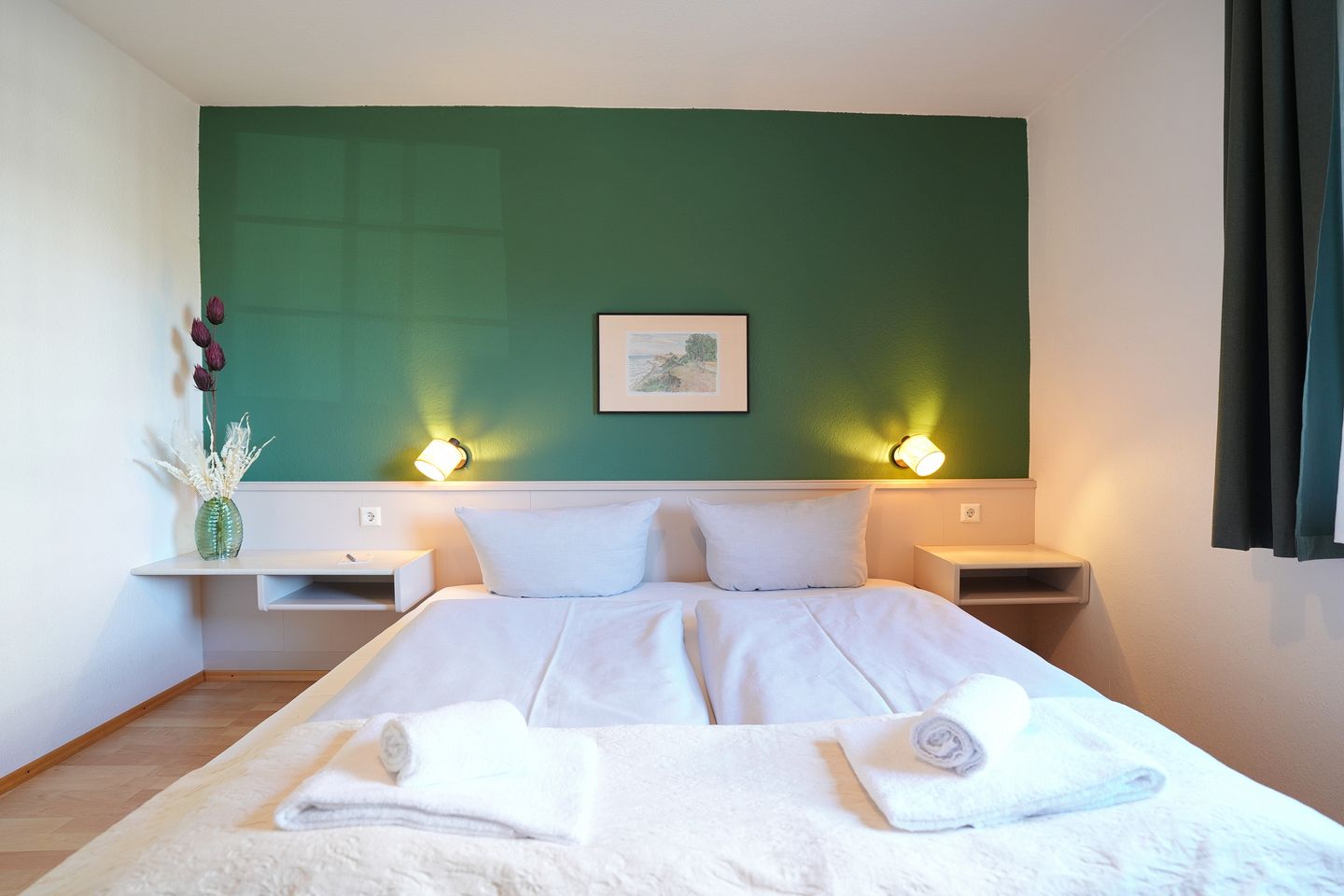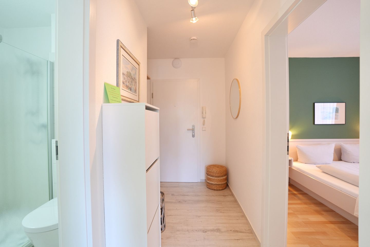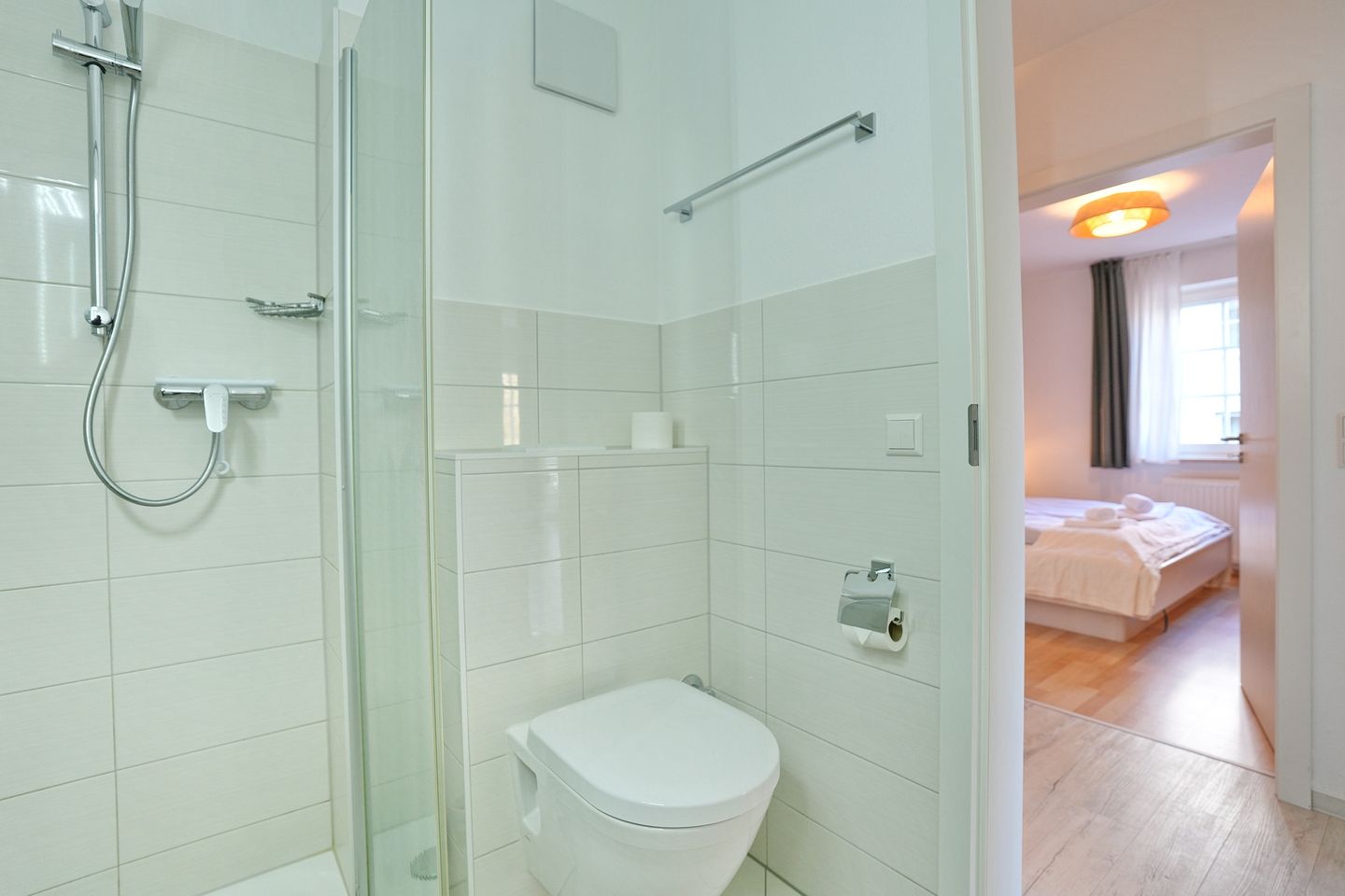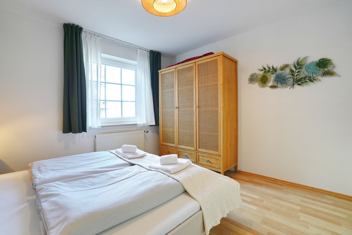 Im separaten Schlafzimmer erwarten Sie ein großzügiges Doppelbett (1,80 m x 2,00 m) sowie ein geräumiger Kleiderschrank. Das moderne Badezimmer ist mit einer Dusche und einem Haartrockner ausgestattet.