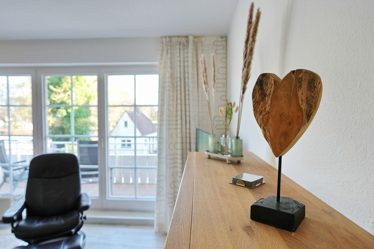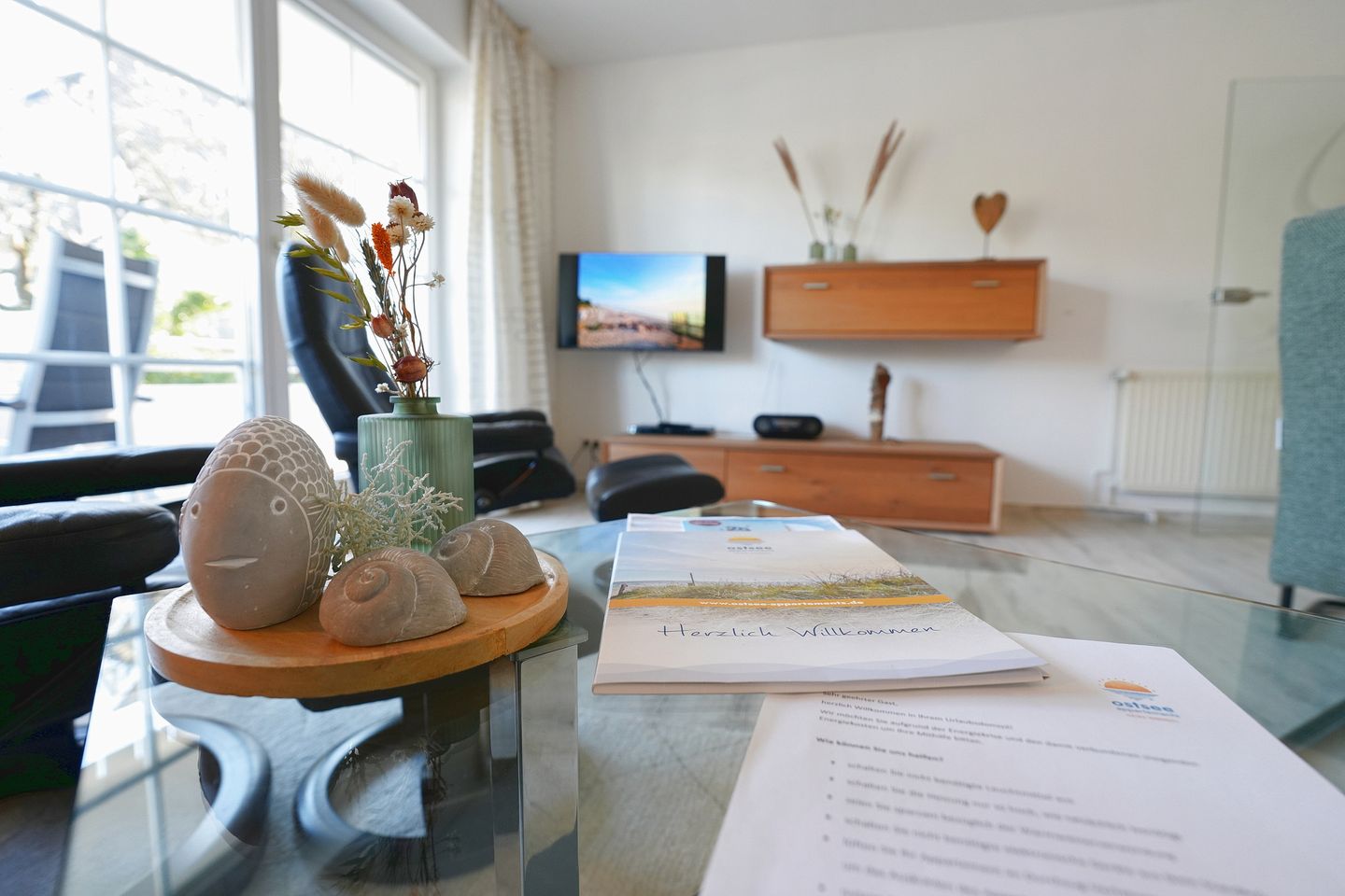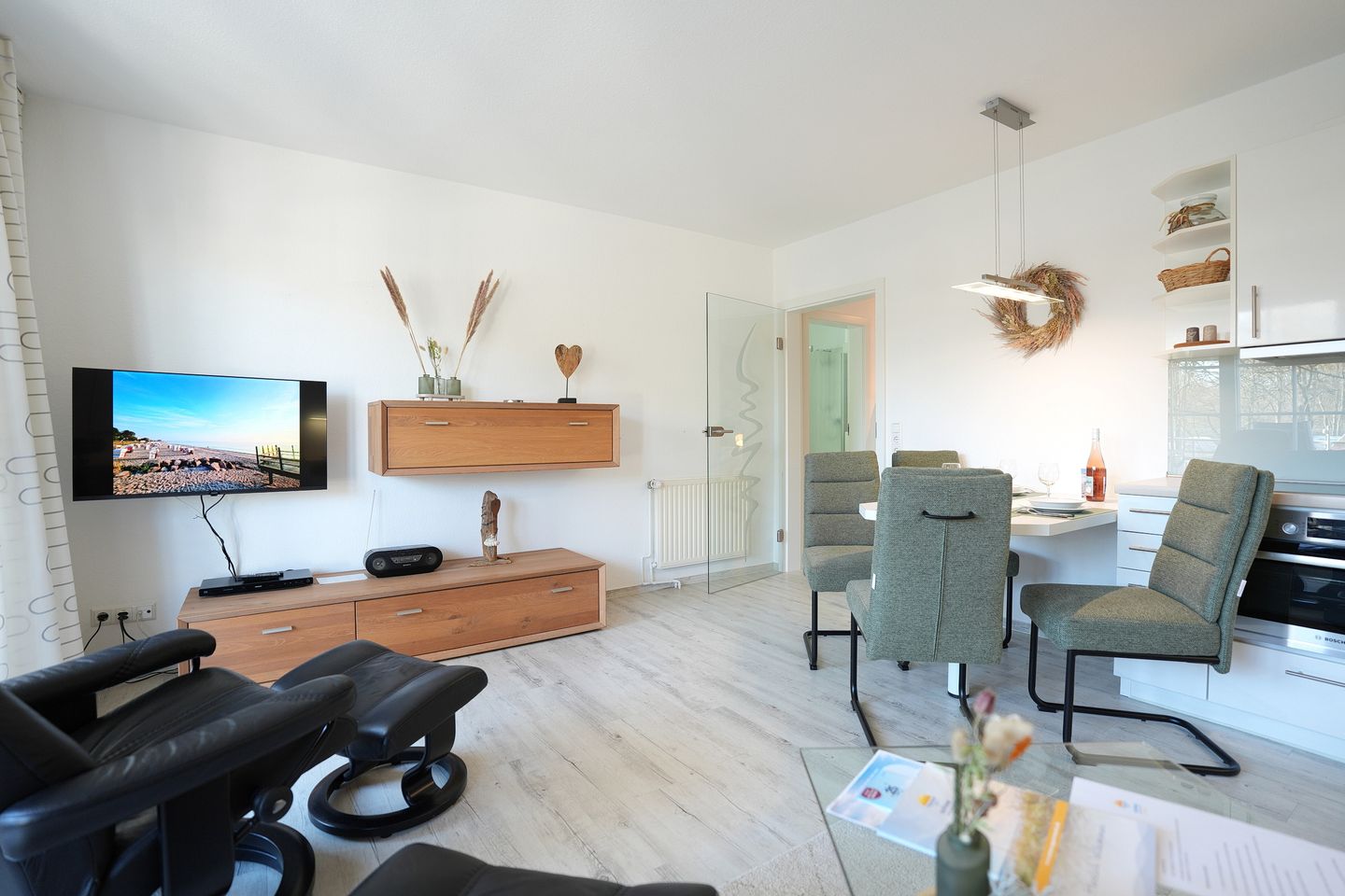 Das gemütliche Wohnzimmer lädt mit zwei hochwertigen Stressless Sesseln und einem Flachbildfernseher mit Kabel-TV und Onlinezugang zum Entspannen ein. Das Sofa (1,40 x 2,00 m) lässt sich mit wenigen Handgriffen in ein komfortables Bett ausziehen. Vom Wohnzimmer aus gelangen Sie auf den großzügigen Südbalkon, der Ihnen viele Sonnenstunden und einen schönen Ausblick bieten kann – perfekt für ein entspanntes Frühstück oder den Ausklang des Tages. In der voll ausgestatteten, offenen Küche mit Esstisch ist unter anderem ein Geschirrspüler und ein Backofen zu finden.