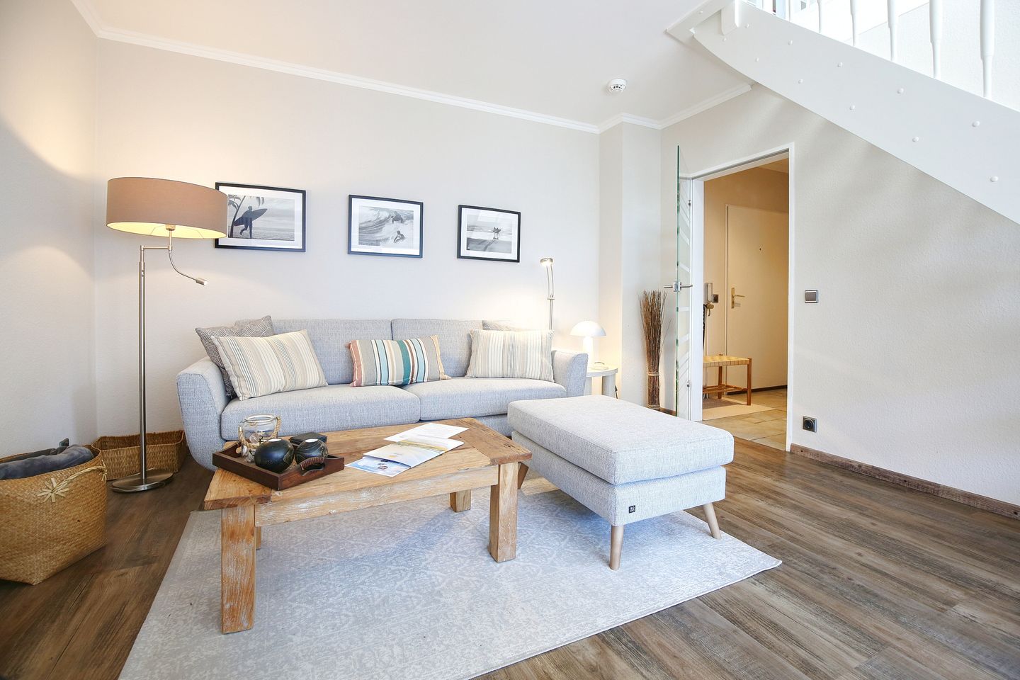Das Appartement über 2 Ebenen ist 55 qm groß und verfügt über einen geräumigen Flur mit Garderobe, von dem das Bad und das Wohn-/Esszimmer abgehen. Vom Wohnzimmer gelangen Sie in die gut ausgestattete Pantry und auf den großen Balkon mit Strandkorb, auf dem Sie durch die Süd-West-Lage bei Abendsonne den Tag in Ruhe ausklingen lassen können. Das Appartement verfügt über einen Smart-TV und eine Bluetooth - Sonos - Box.