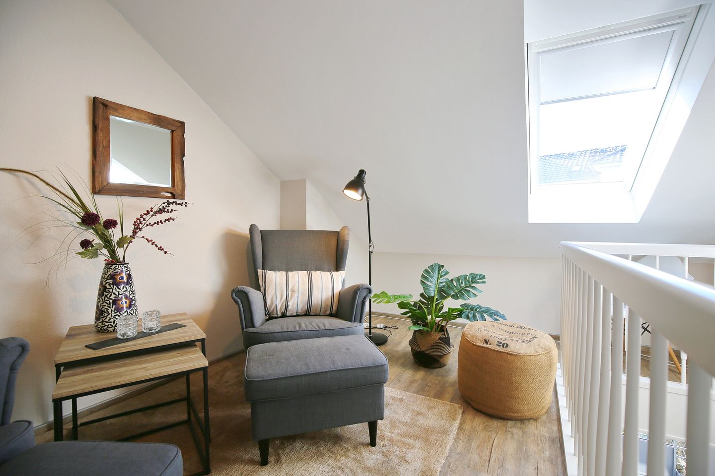 In der Galerie befindet sich eine gemütliche Leseecke neben einem eingebauten Bücherschrank. Der Balkon hat Süd-West-Ausrichtung und kann mit einer Markise vor zu viel Sonne geschützt werden. Der Balkon ist ca. 4 m x 1,8m groß und mit einem Teaktisch, 2 Stühlen und einem Strandkorb ausgestattet. Das Badezimmer befindet sich auf der gleichen Ebene wie das Wohnzimmer und die Küche und ist über den großen Flur zu erreichen. Das Badezimmer verfügt über eine Dusche sowie WC. Das innenliegende Bad hat einen verglasten Fensterausschnitt (Milchglas) zur Küche, eine Handtuchheizung, einen beleuchteten Spiegel, sowie ausreichend Abstellmöglichkeiten für Ihre Badeutensilien. Ein Haartrockner ist vorhanden. Im Gemeinschaftskeller befindet sich eine Waschmaschine und ein Trockner, die gegen ein kleines Entgelt genutzt werden kann. Haustiere sind nicht erlaubt, Nichtraucher-Wohnung, PKW Stellplatz am Haus vorhanden.
