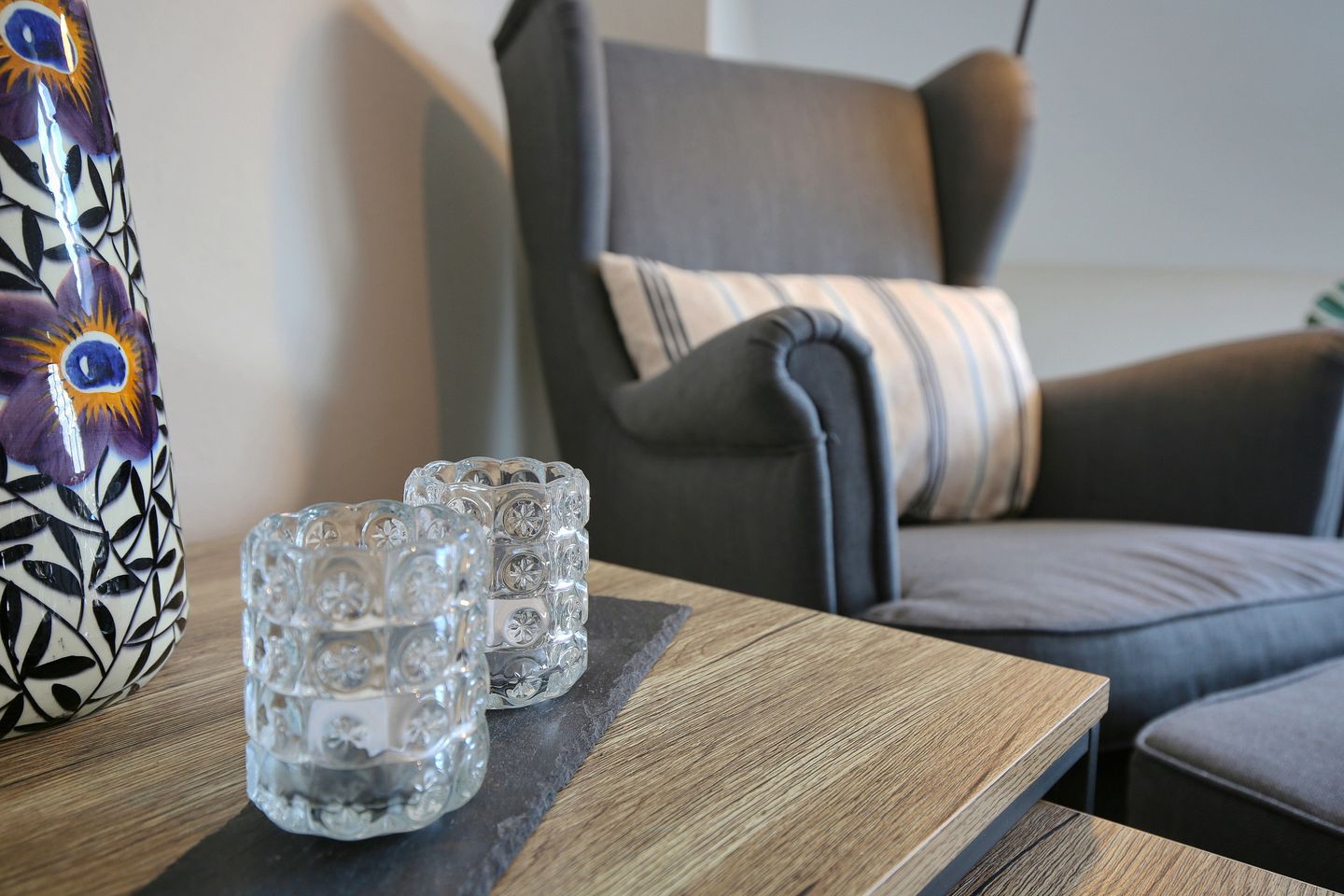 Die Küche ist ausgestattet mit einem 4-Platten-Cerankochfeld und einem Backofen, Kühlschrank mit kleinem Gefrierfach, Toaster, Wasserkocher, Kaffeemaschine und Senseomaschine. Der Essbereich befindet sich direkt am Fenster vor dem großen Balkon. Der Esstisch ist aus massivem Teakholz. Vom Wohnzimmer aus gelangen Sie über eine Treppe auf eine Galerie und zum Schlafzimmer, in dem sich ein geräumiger Kleiderschrank und ein gemütliches Boxspringbett 160 cm x 200 cm, befinden.