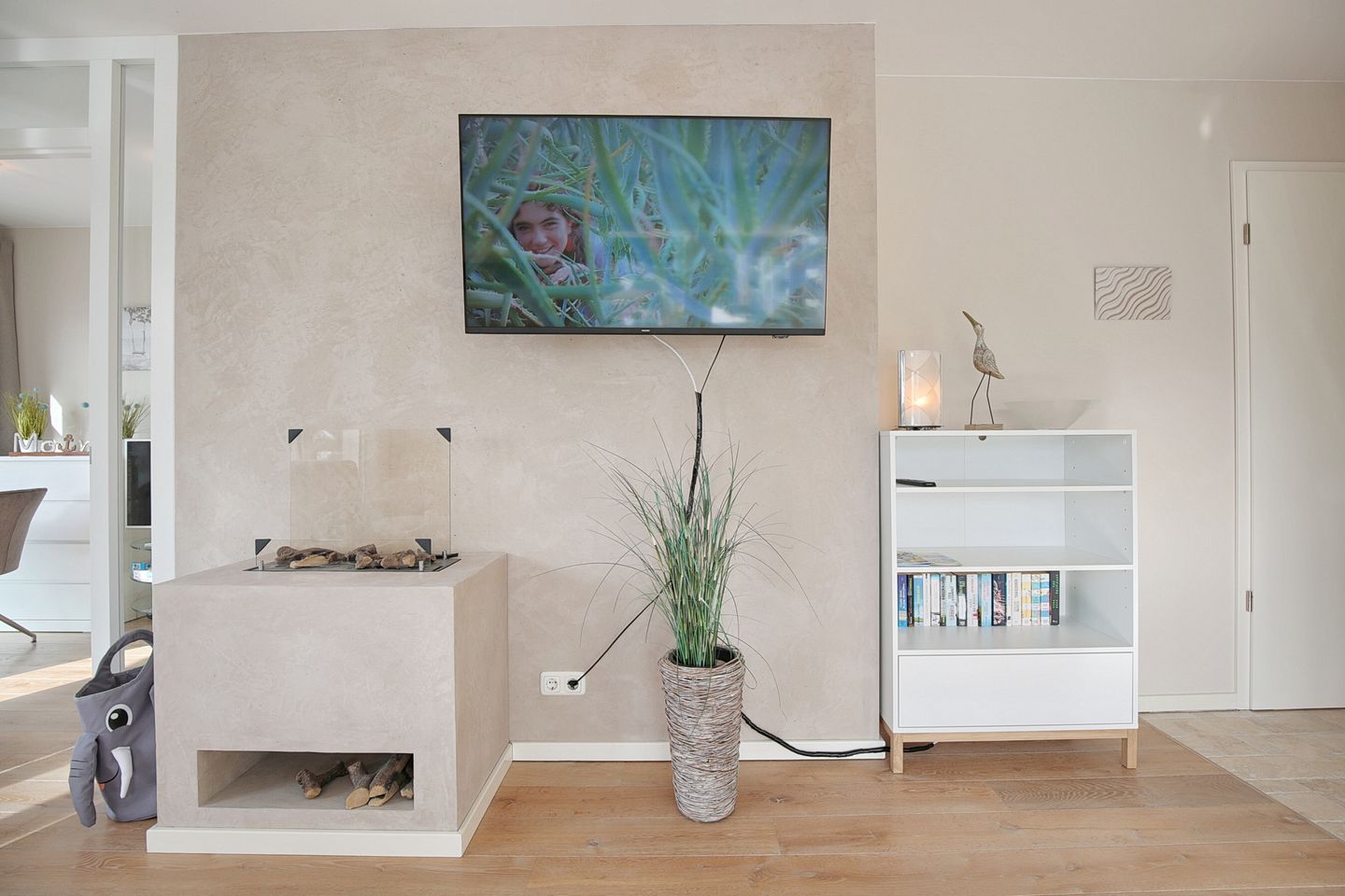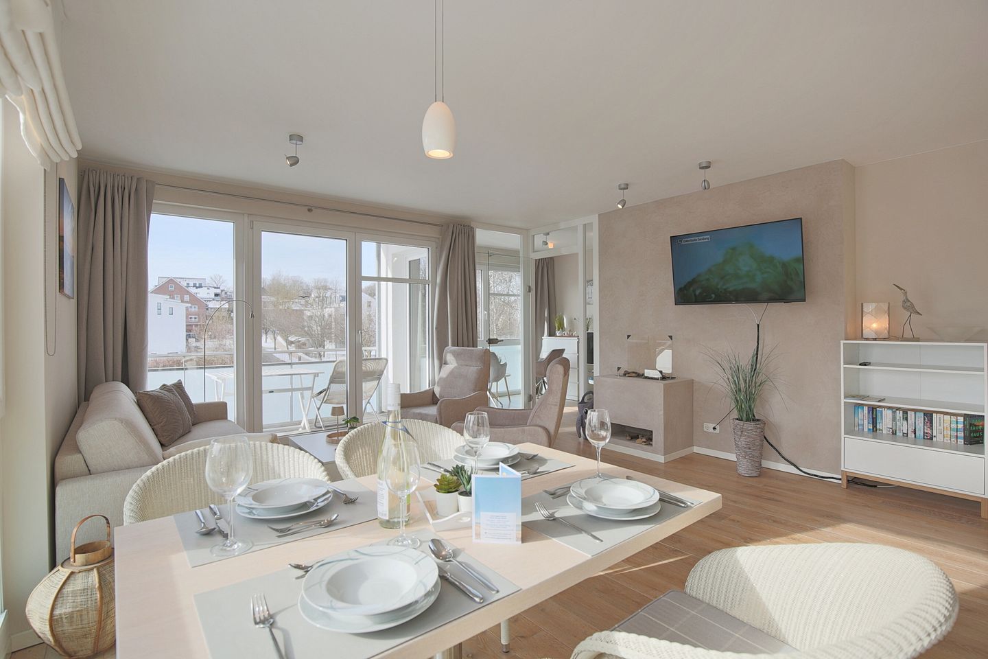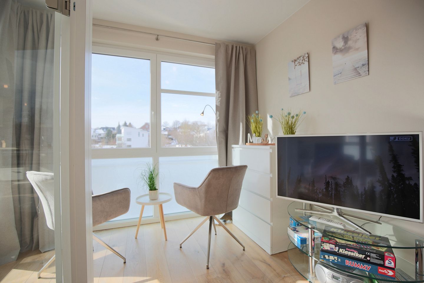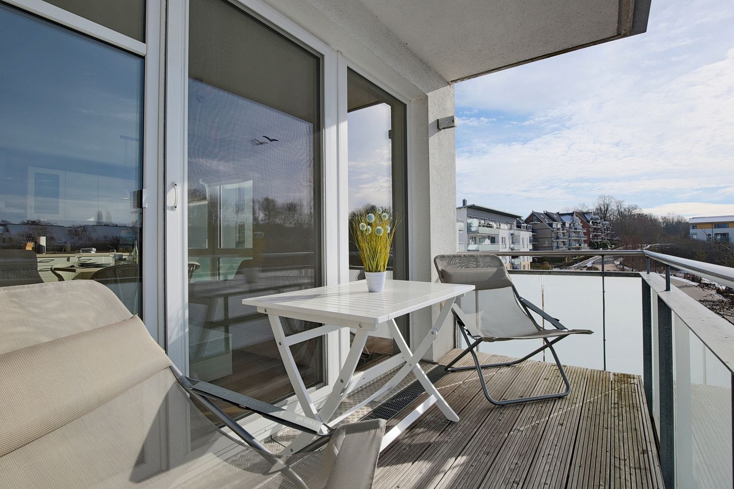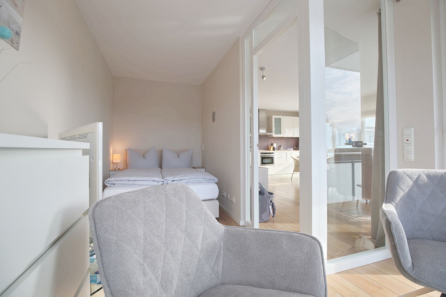Der Wohnbereich mit Schlafcouch (1,60 x 2,00 m) ist offen gestaltet und geht direkt in die Küche über. Die offene Küche zum Wohnzimmer schafft eine kommunikative Atmosphäre – praktisch für gemeinsame Mahlzeiten und entspannte Abende. Zur Küchenausstattung gehören Herd mit Cerankochfeld, Mikrowelle, Kühlschrank mit Gefrierfach, Spülmaschine sowie einer Filter- Kaffeemaschine, Wasserkocher und Toaster. Von dort aus gelangen Sie in der angrenzende Schlafzimmer, das durch eine Glastür vom Wohnzimmer aus zugänglich ist. Der kleine Schlafbereich ist mit einem Doppelbett (1,40 x 2,00 ) und einen zusätzlichen TV ausgestattet. Von hier aus gelangen Sie auf den West-Balkon. Auf dem Balkon können Sie den Tag ruhig beginnen oder ausklingen lassen