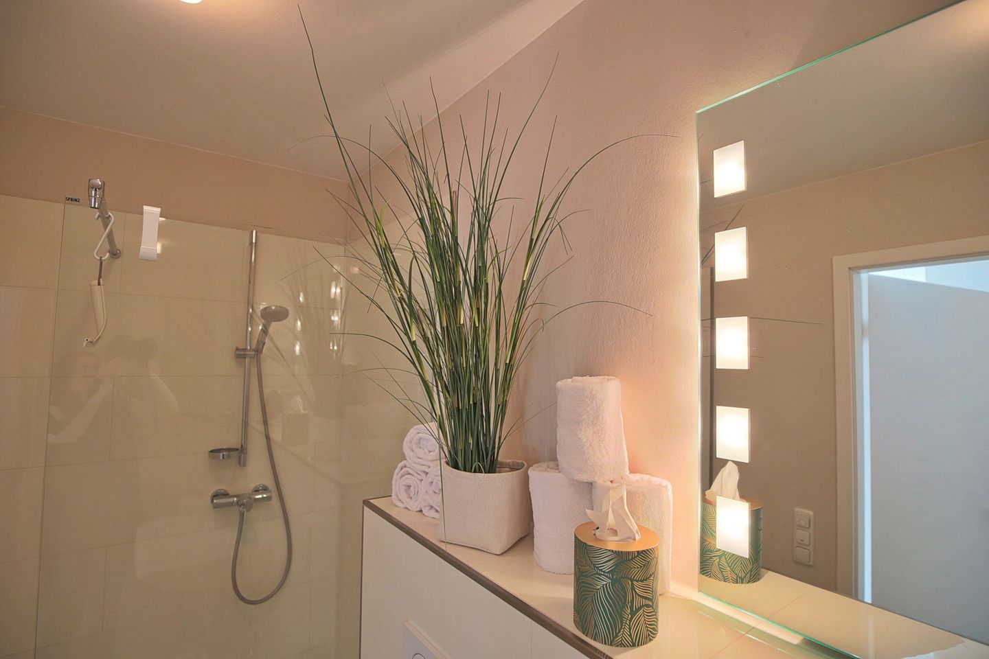 Das zweite Schlafzimmer ist mit einem Doppelbett 1,80 x 2,00 m und einer Kommode ausgestattet. Das Badezimmer ist mit einer ebenerdigen Dusche ausgestattet und bietet Ihnen außerdem einen Haartrockner sowie einen Kosmetikspiegel für die tägliche Routine. Für Komfort zu jeder Jahreszeit sorgt eine Fußbodenheizung.