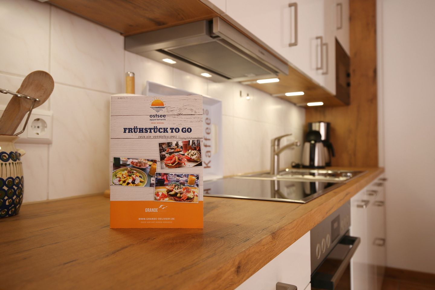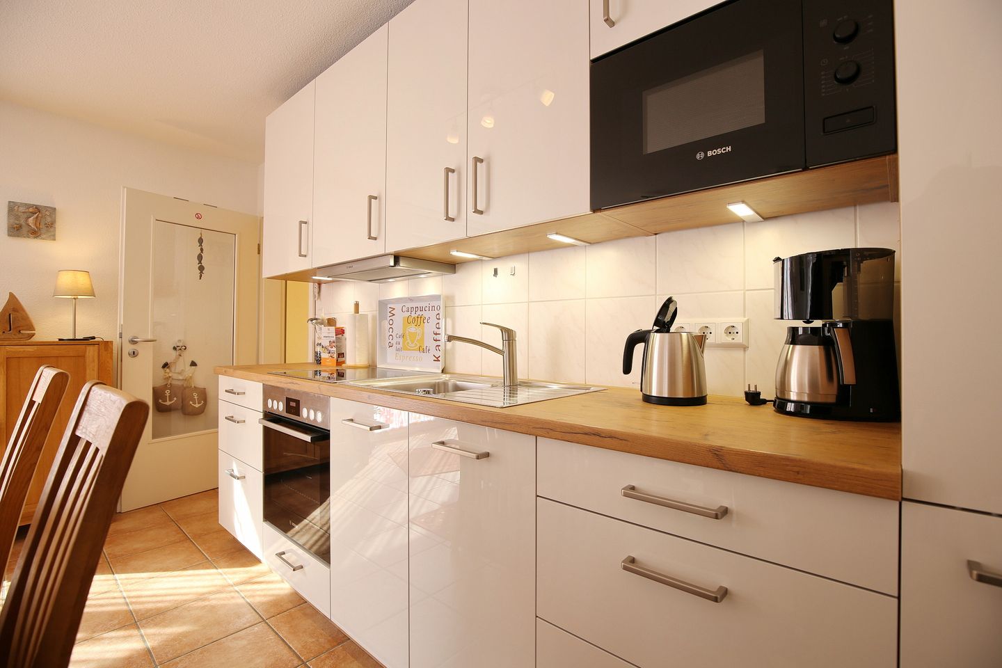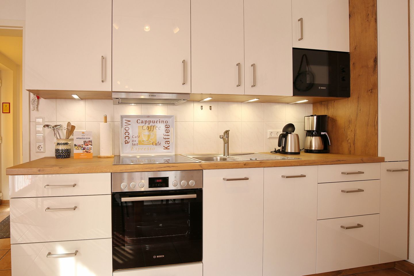 Die offene, helle Küchenzeile mit Backofen, Mikrowelle, Ceranfeld und Spülmaschine sorgen für ein entspanntes Kochen. Der Wasserkocher, der Toaster sowie die Filterkaffeemaschine tragen hierzu bei.