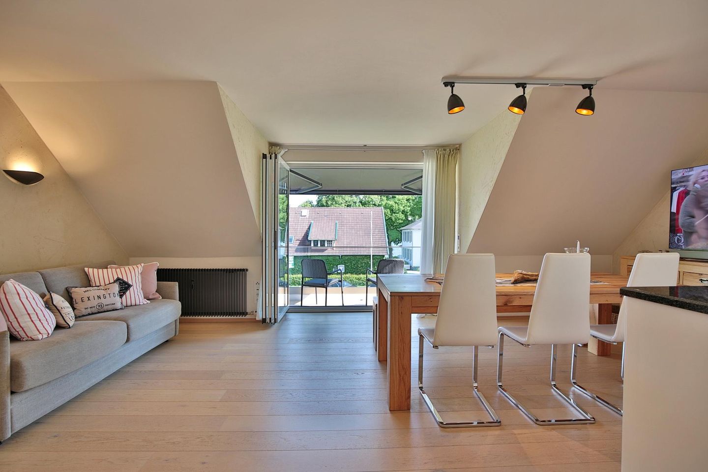 Der Wohn-/ Essbereich ist in dezenten Beigetönen gehalten. Einen besonders herrlichen Ausblick genießen Sie vom Essbereich an dem großzügigen Fenster-Schiebeelement.