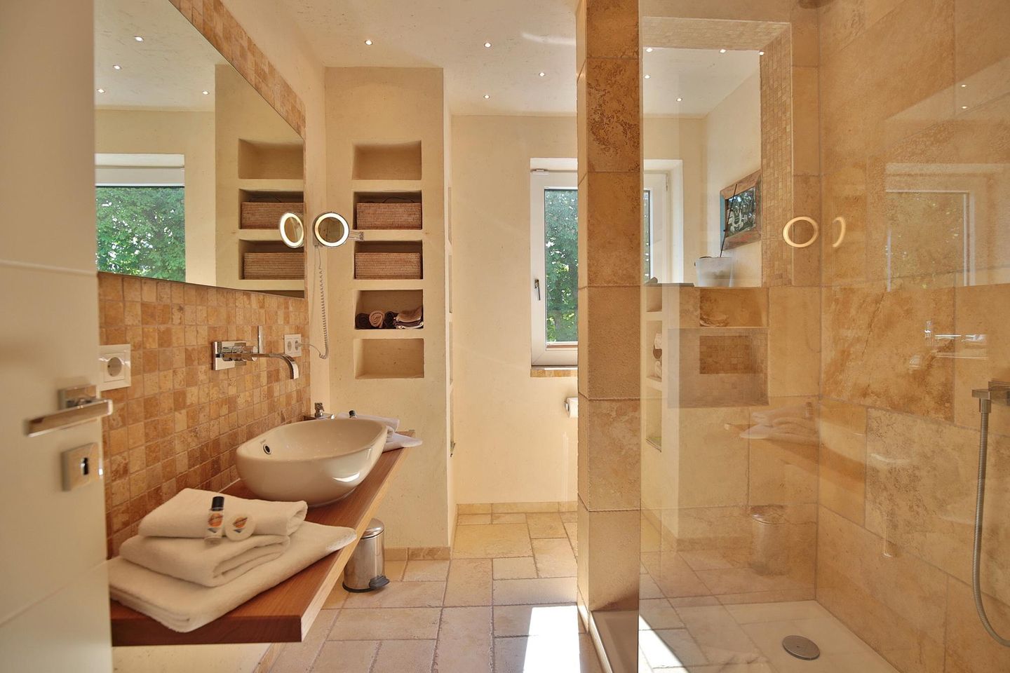 Das Badezimmer ist mit hochwertigen Armaturen aus dem Hause Dornbracht und einem Decor-Walther Kosmetikspiegel ausgestattet.