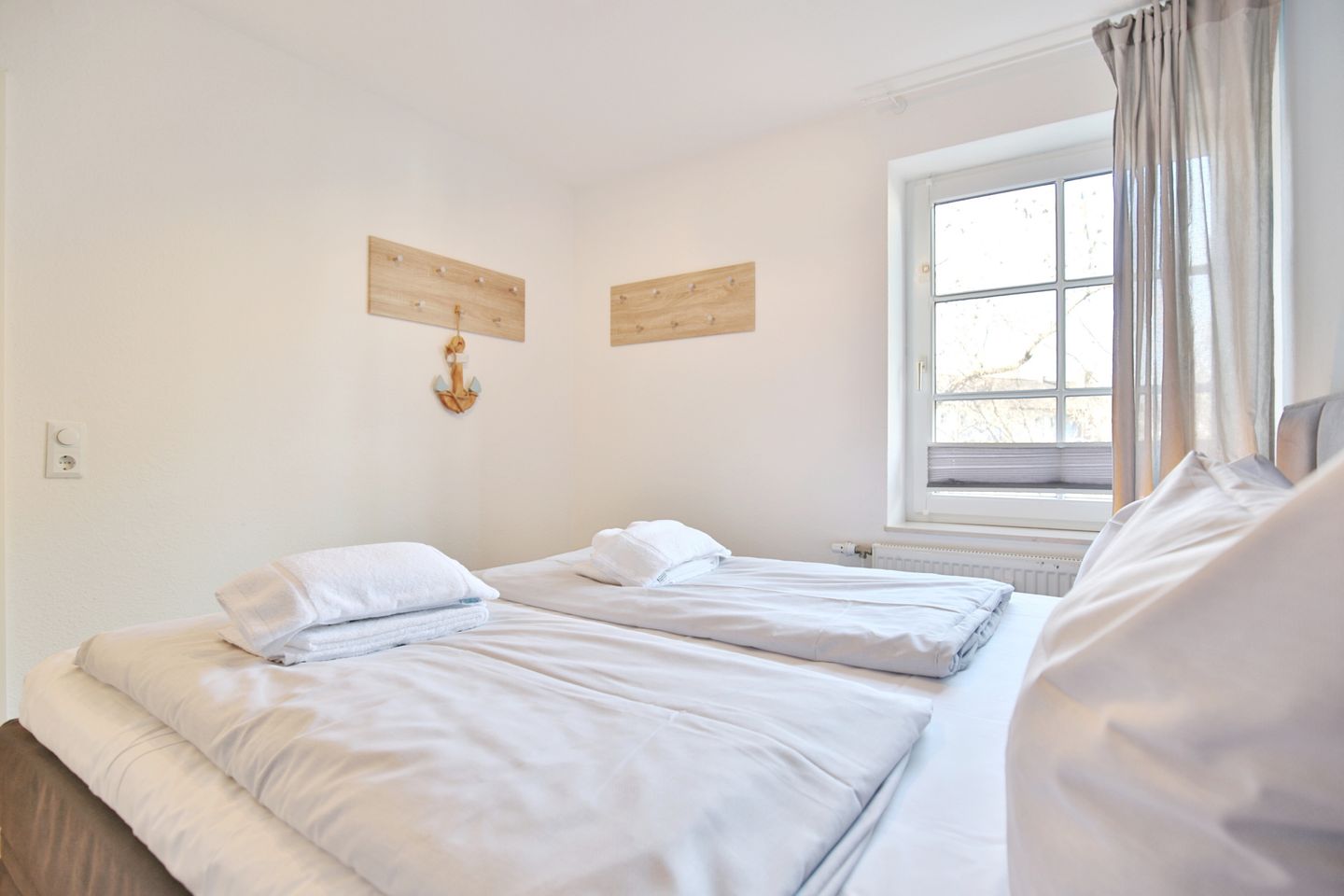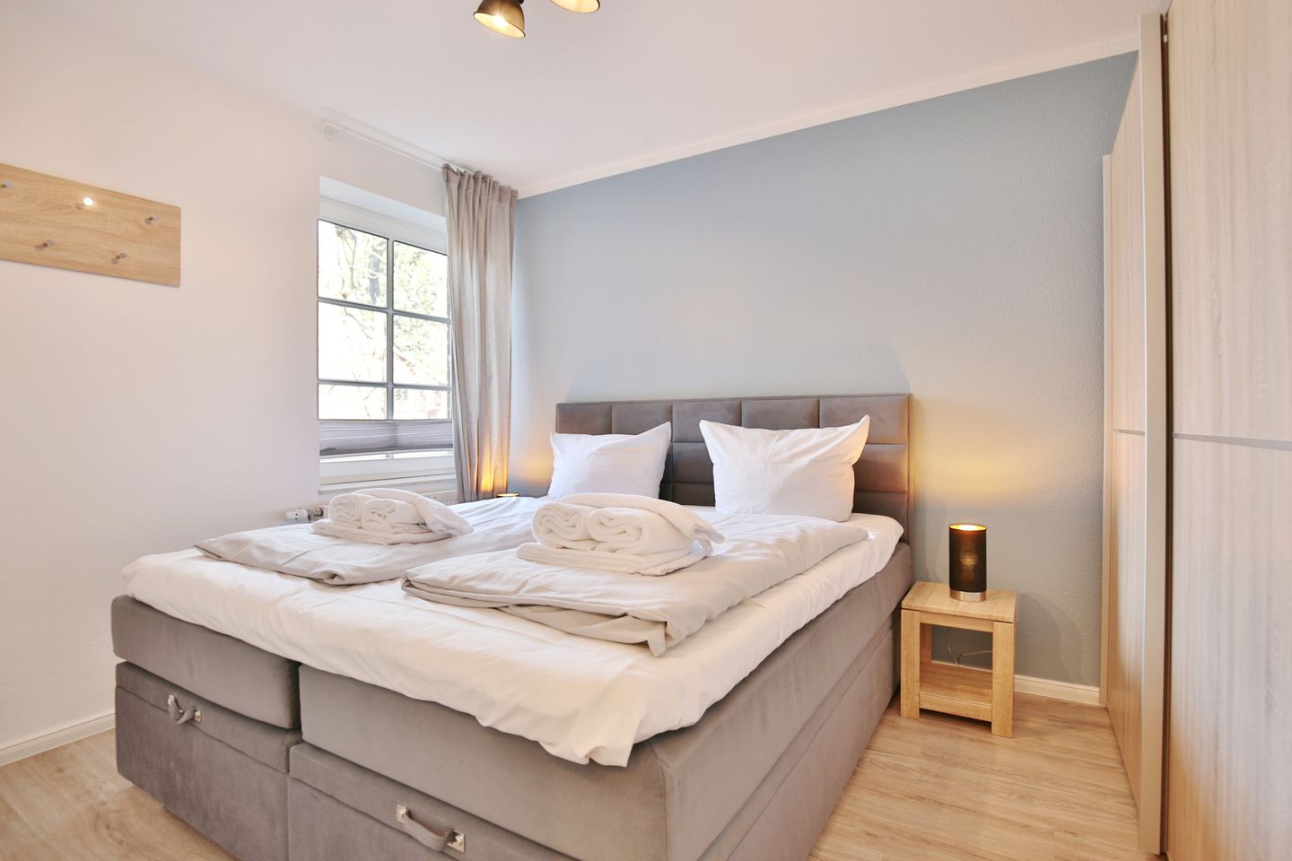 Das neu eingerichtete Schlafzimmer ist mit einem komfortablem Boxspringbett (1,80 x 2,00m, durchgehender Topper) und einem großzügigen Kleiderschrank ausgestattet.