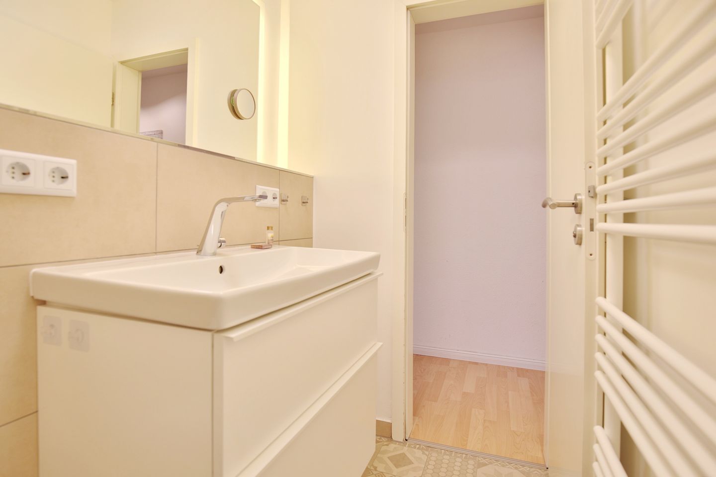 Das hell gehaltene Bad verfügt über Dusche, WC und zwei Einzelwaschtischen.