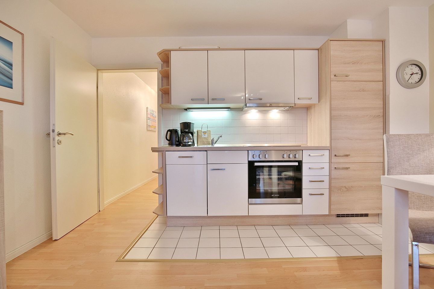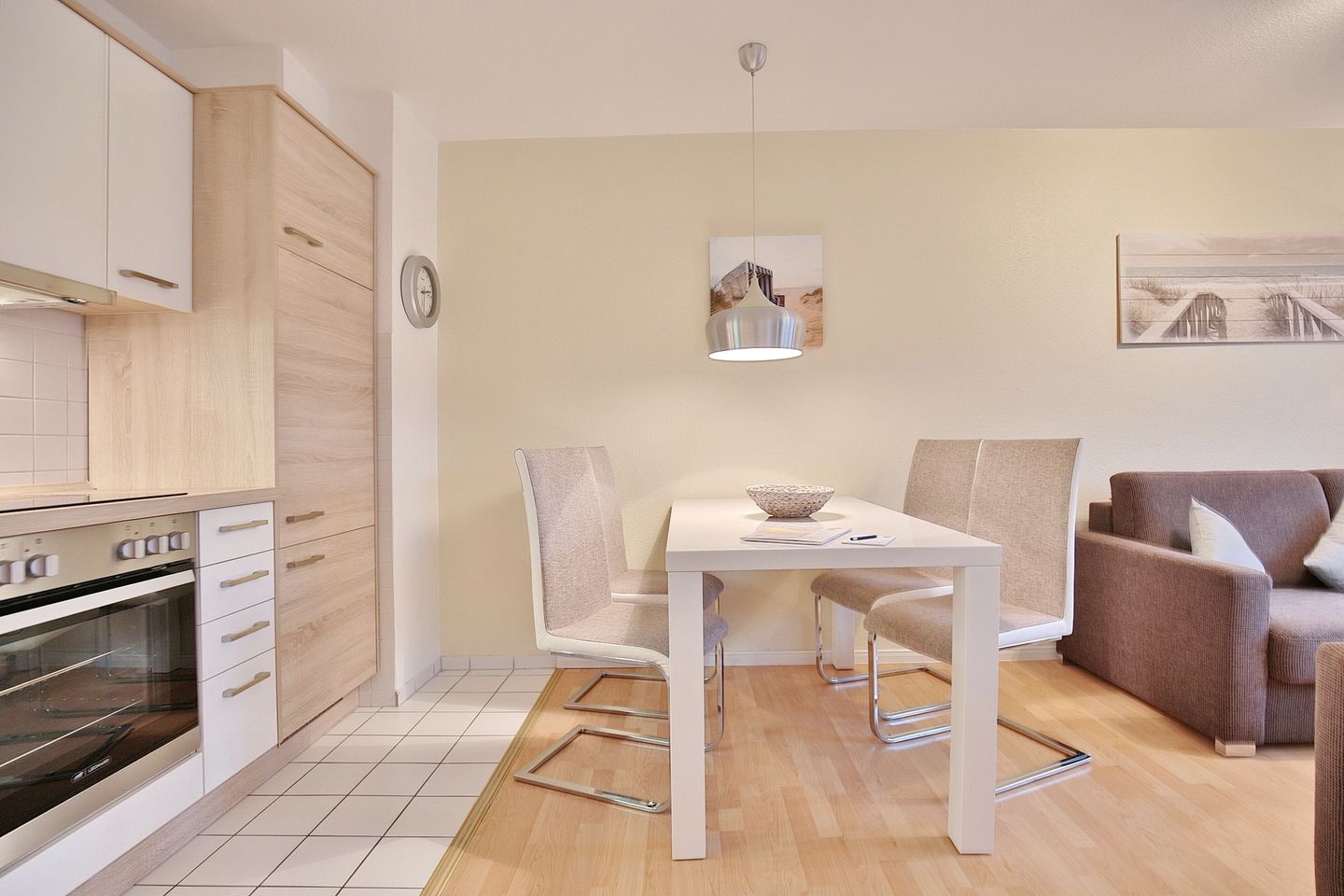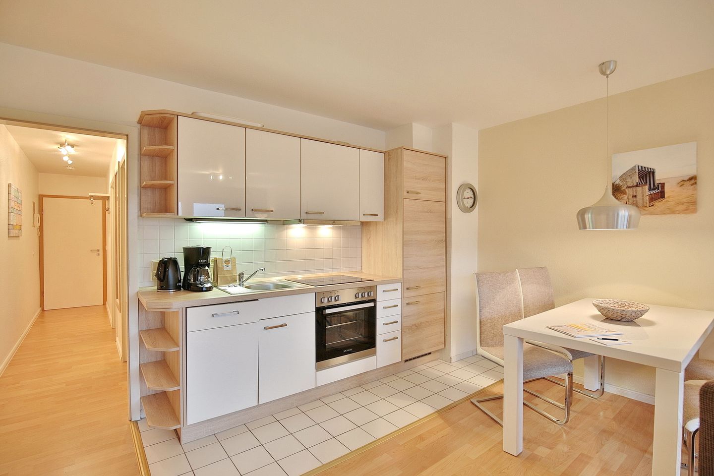 Eingerichtet ist das Appartement mit einem Sofa und zwei Sesseln, Flachbild-TV, Radio/CD, Essplatz für 4 Personen und einer neuen Einbauküche. Diese verfügt über Gefrierschrank, Cerankochfeld, Backofen und einer Spülmaschine. Diverse Kleingeräte wie Kaffeemaschine, Toaster, Heißwassergerät sind ebenfalls vorhanden.