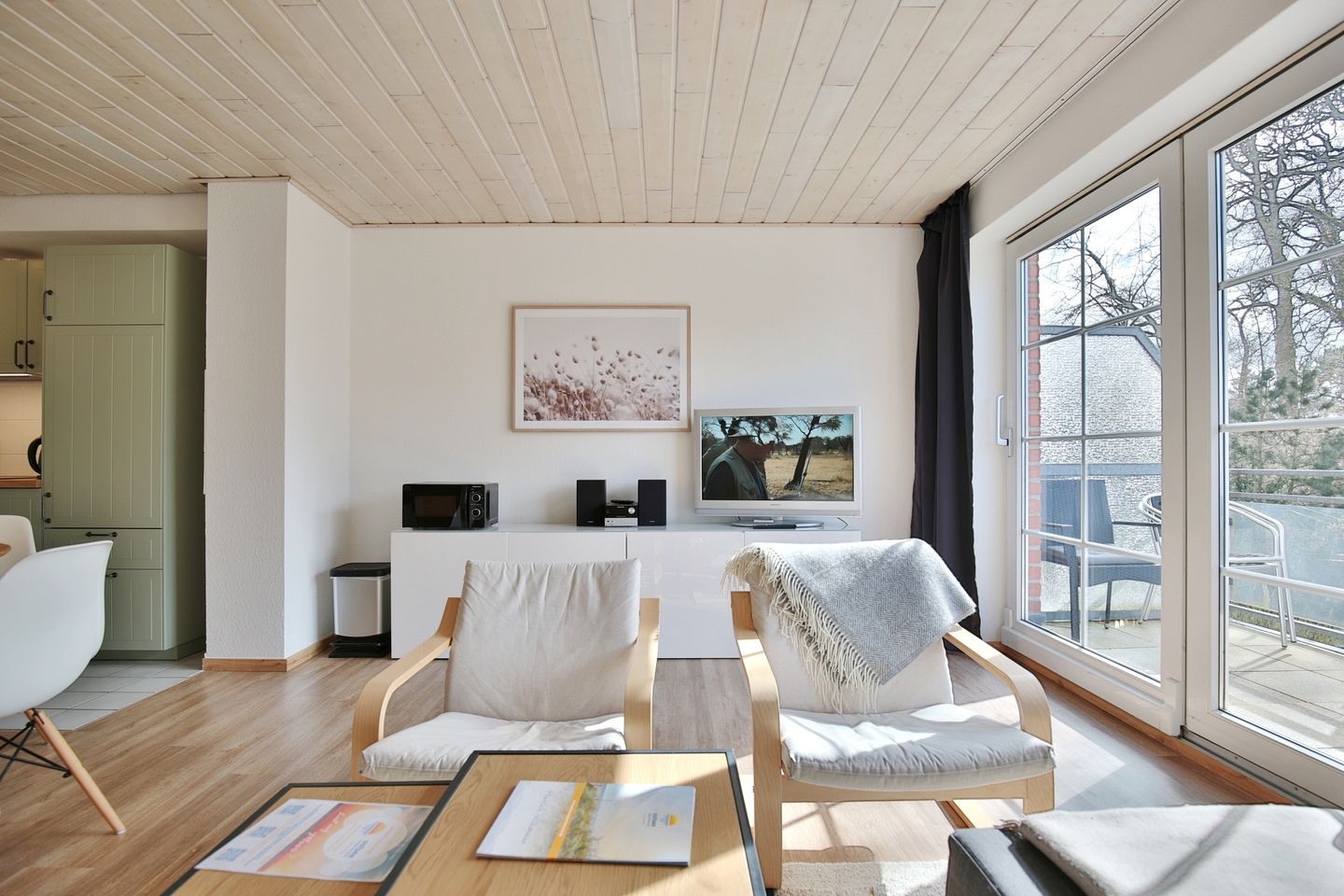 Vom Sofa aus kann der schöne Blick ins Grüne genossen werden und der Zugang zum Balkon erfolgt über die große, bodentiefe Fensterfront. Hier sind Sitzplätze und ein Sonnenschirm vorhanden.