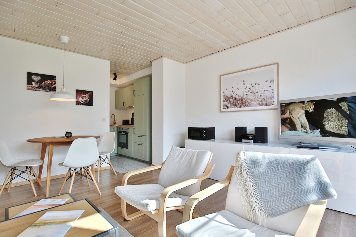 Im Wohnschlafzimmer befindet das Sideboard mit Stauraum und ein Schlafsofa mit 2 Schlafplätzen, ein LCD-Fernseher mit HDMI-Anschluss (Kabel bitte selber mitbringen) und eine Bluetooth-fähige HiFi-Anlage.