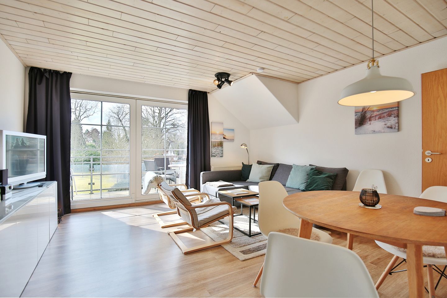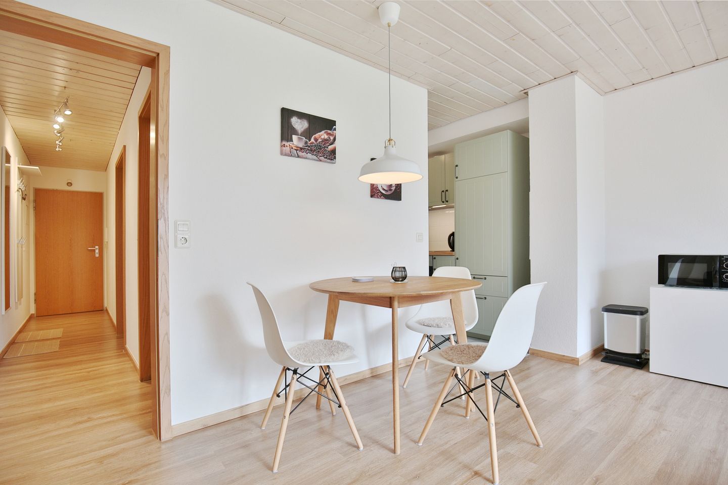 Der helle Essplatz für 4 Personen schließt sich an die Küchennische an und geht in den Wohnbereich über.