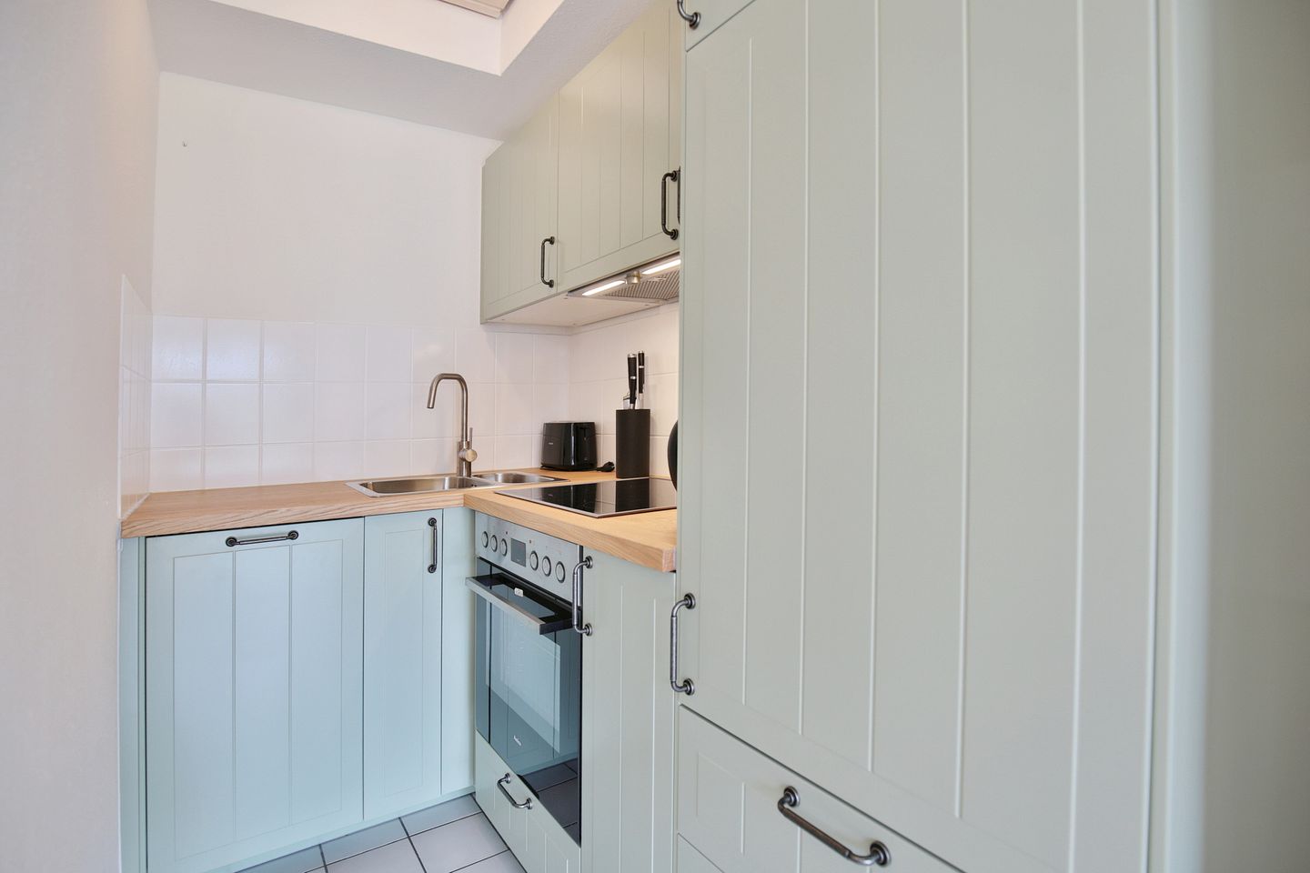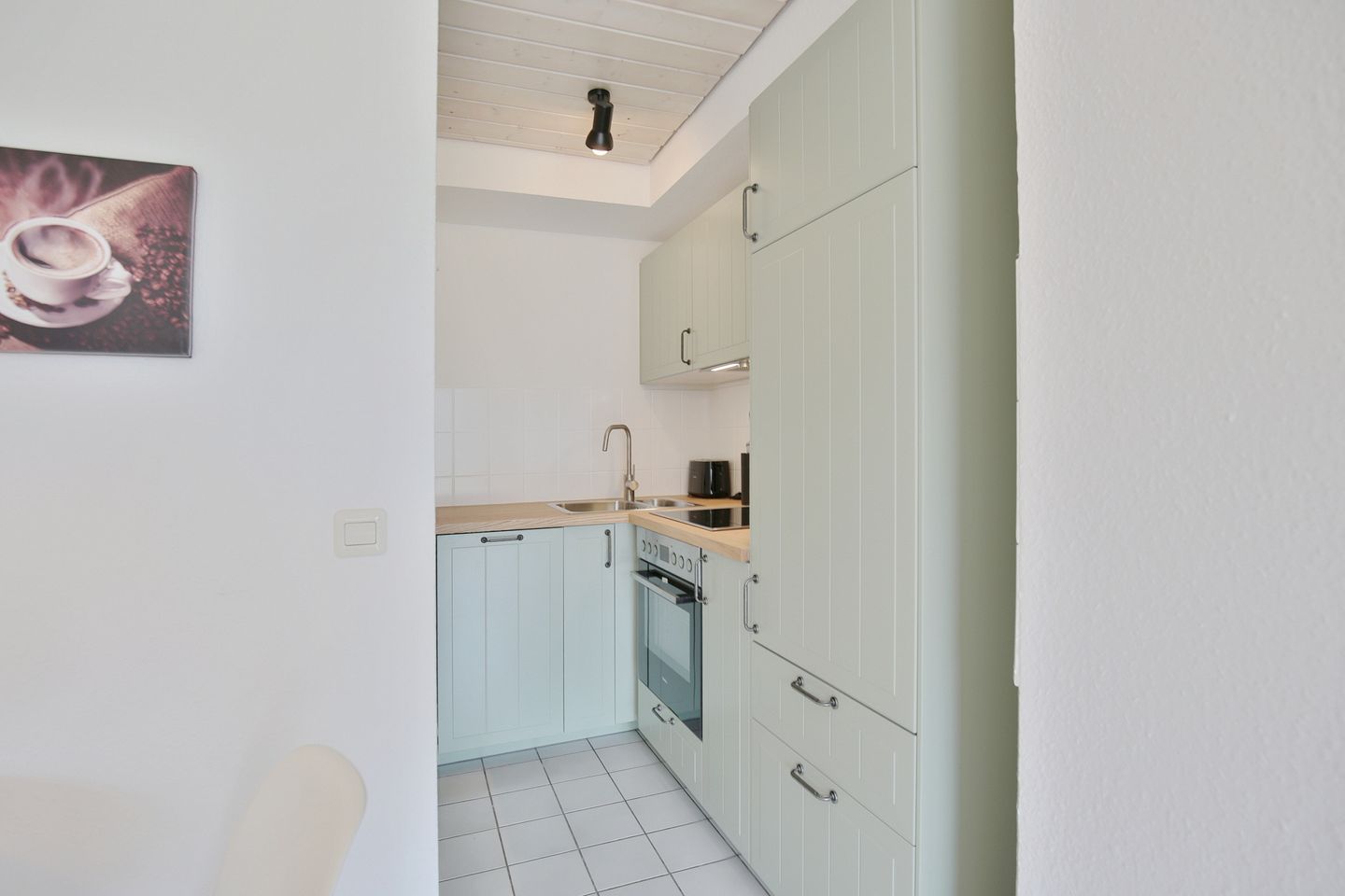 Die Küchennische, mit einer neuen Küche aus dem Jahr 2026, mit Herd, Backofen, Spülmaschine, Mikrowelle und Kühlschrank mit Gefrierfach, geht vom dem ca. 22 qm großen Wohn-Essbereich ab.