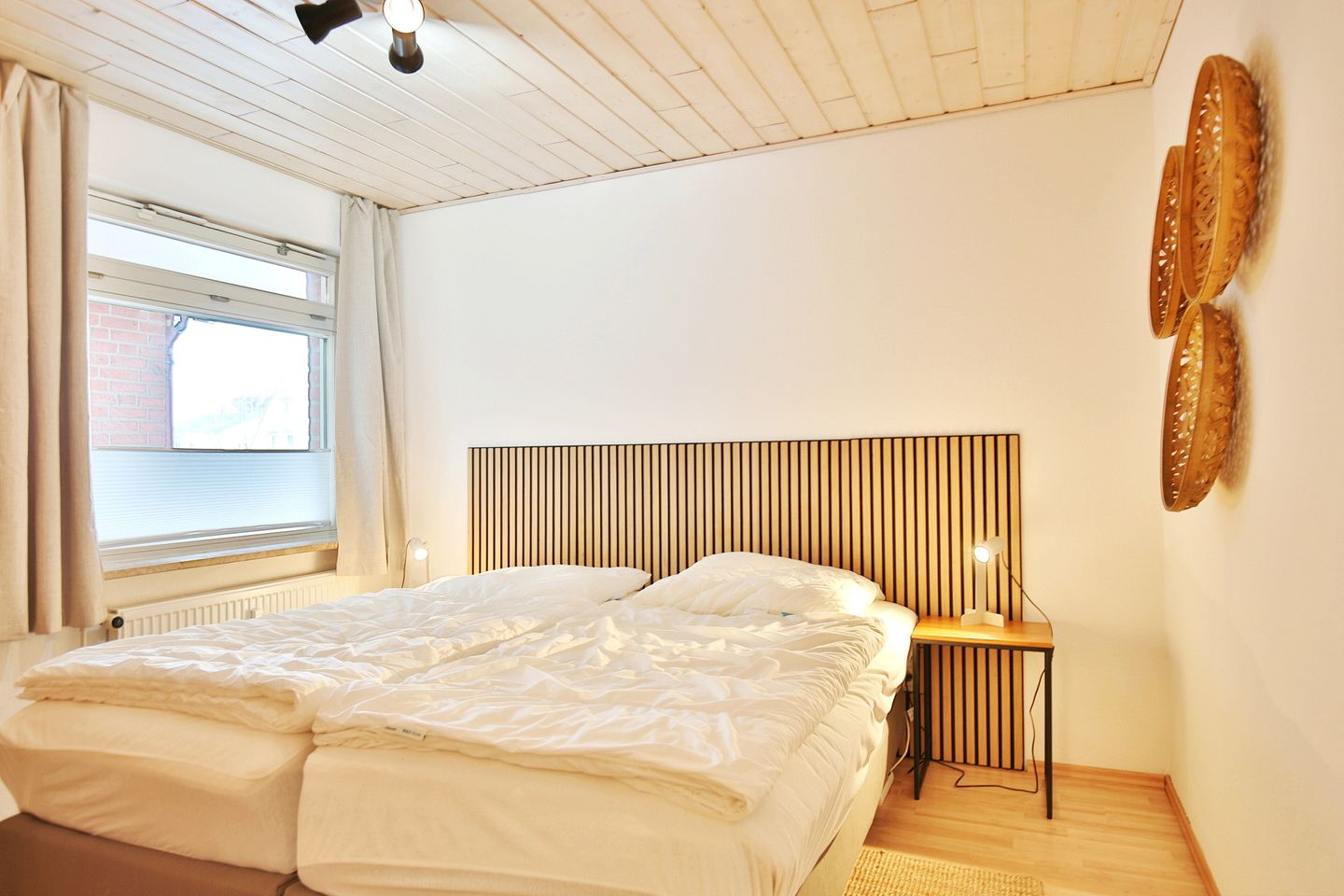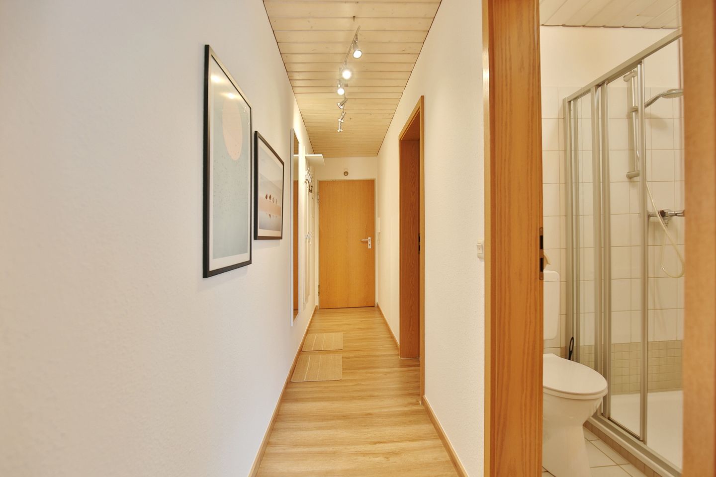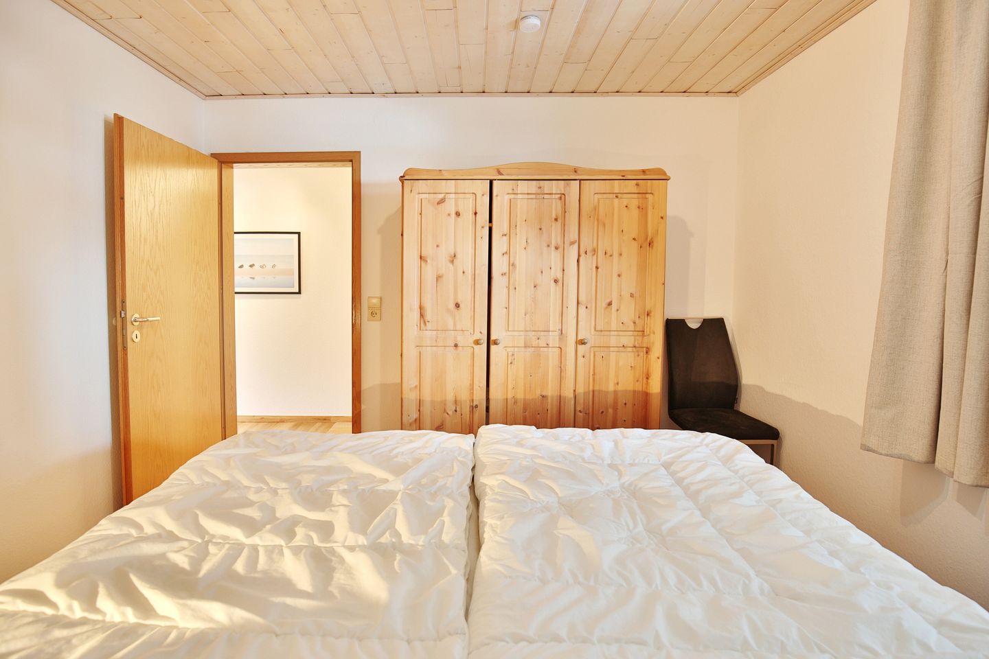 Das Schlafzimmer verfügt über das große Doppelbett (200x200cm) mit getrennten Matratzen und den Kleiderschrank. Neben dem Schlafzimmer und vom Flur abgehend, dieser ist mit Spiegel und Garderobe ausgestattet, befindet sich das Duschbad.