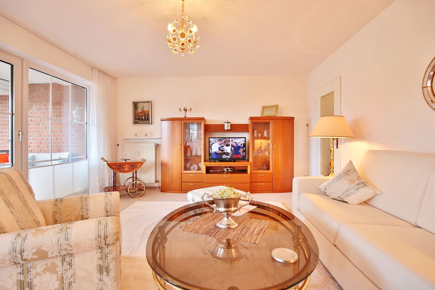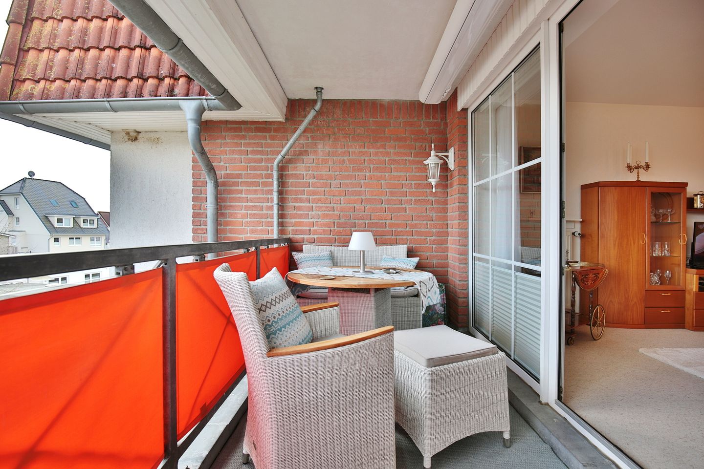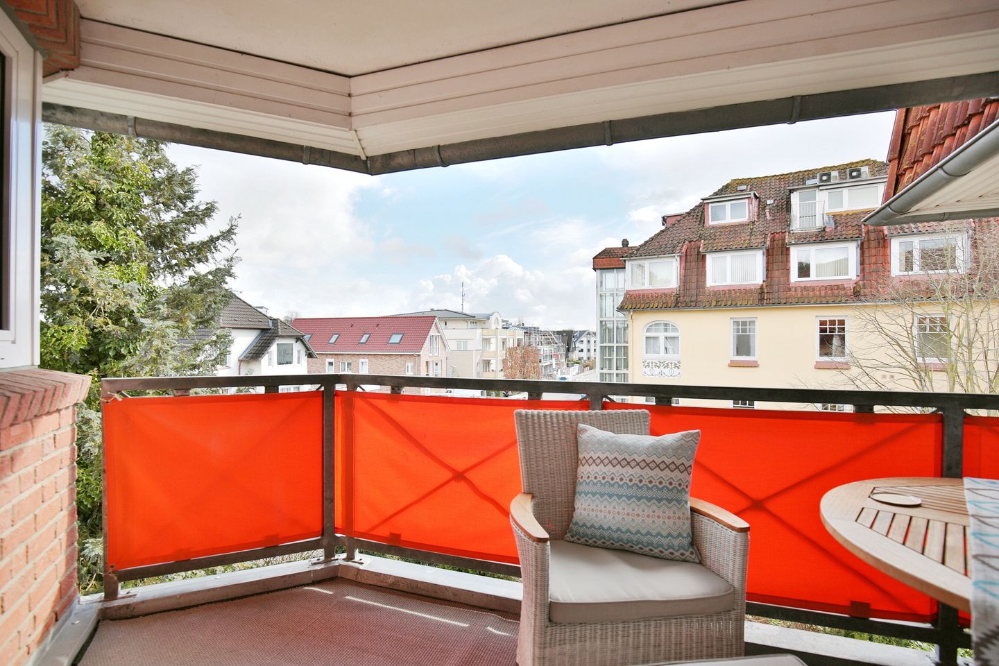 Im gemütlichen Wohnbereich erwartet Sie ein Schlafsofa (1,50 x 2,0 m), Sessel und ein TV (nutzbar mit Fire-TV-Stick). Außerdem haben Sie Zugang zu einem der beiden Balkone, welcher mit bequemen Möbeln ausgestattet ist. Im Erker des Wohnzimmers empfängt Sie ein Essbereich für 4 Personen.