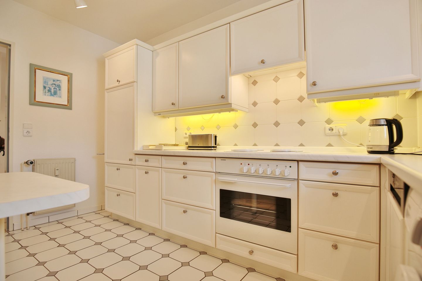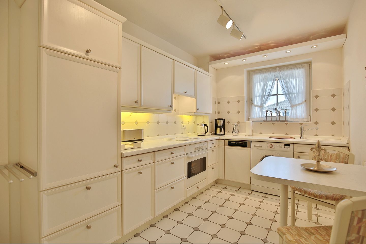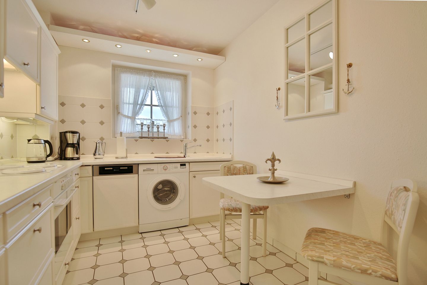 Die geschlossene Küche ist funktional ausgestattet und unterstützt eine angenehme Selbstversorgung. Ihnen stehen unter anderem ein Herd mit 4 Platten, Backofen, Kühlschrank mit Gefrierfach, Spülmaschine, Kaffeemaschine, Wasserkocher, Toaster sowie Küchenutensilien, Geschirr und Besteck zur Verfügung. Eine Waschmaschine ist im Appartement vorhanden und darf kostenfrei von Ihnen genutzt werden.