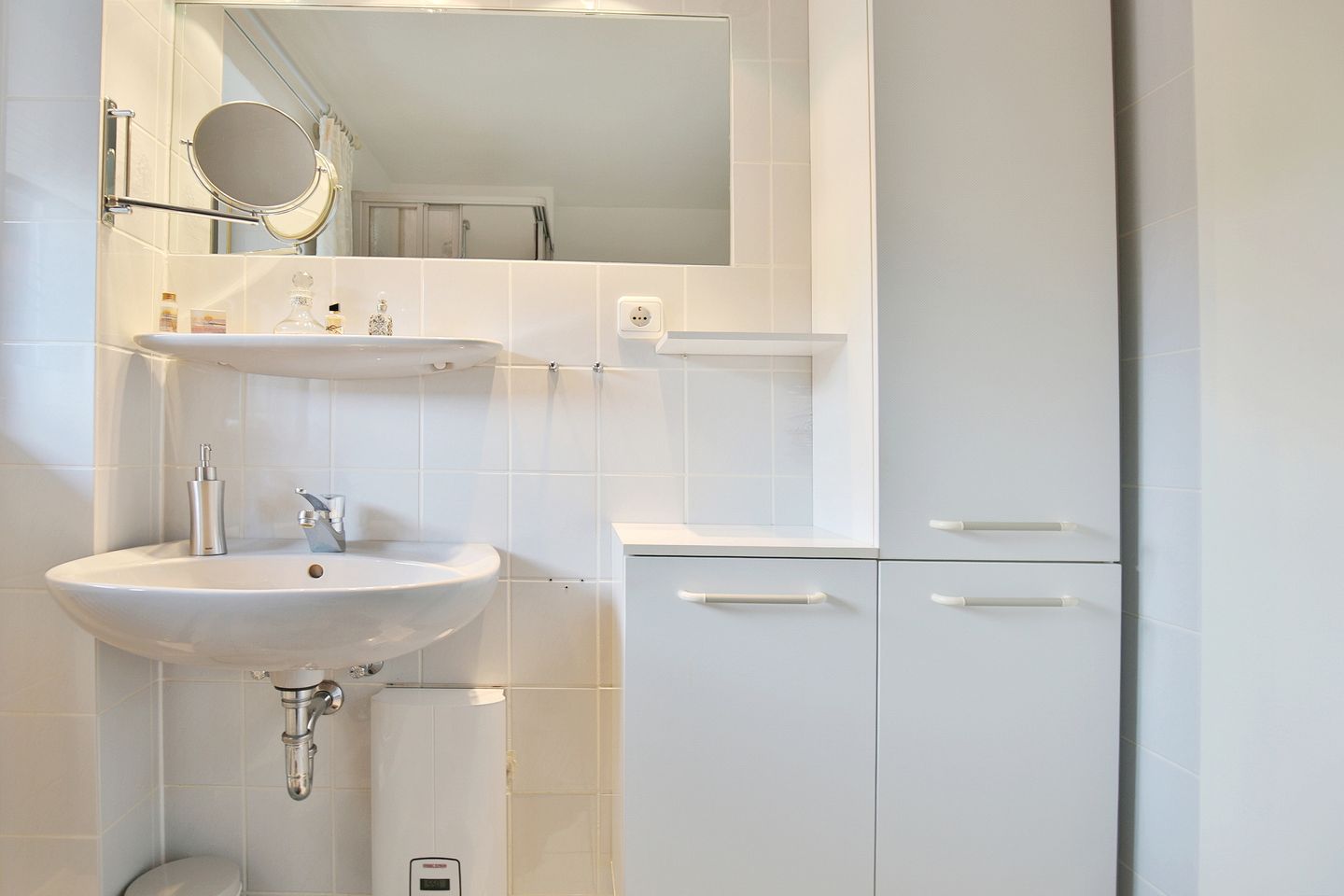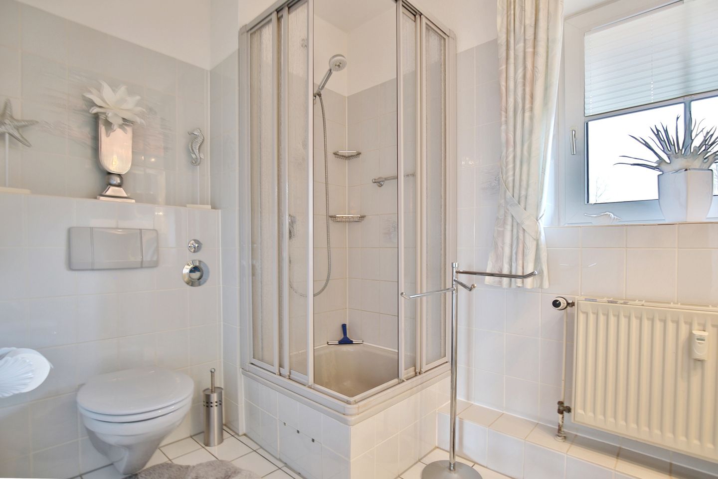 Das Badezimmer verfügt über eine Dusche (Einstiegshöhe 40cm), WC, Waschbecken, Spiegel, Kosmetikspiegel, Haartrockner und ein Fenster.