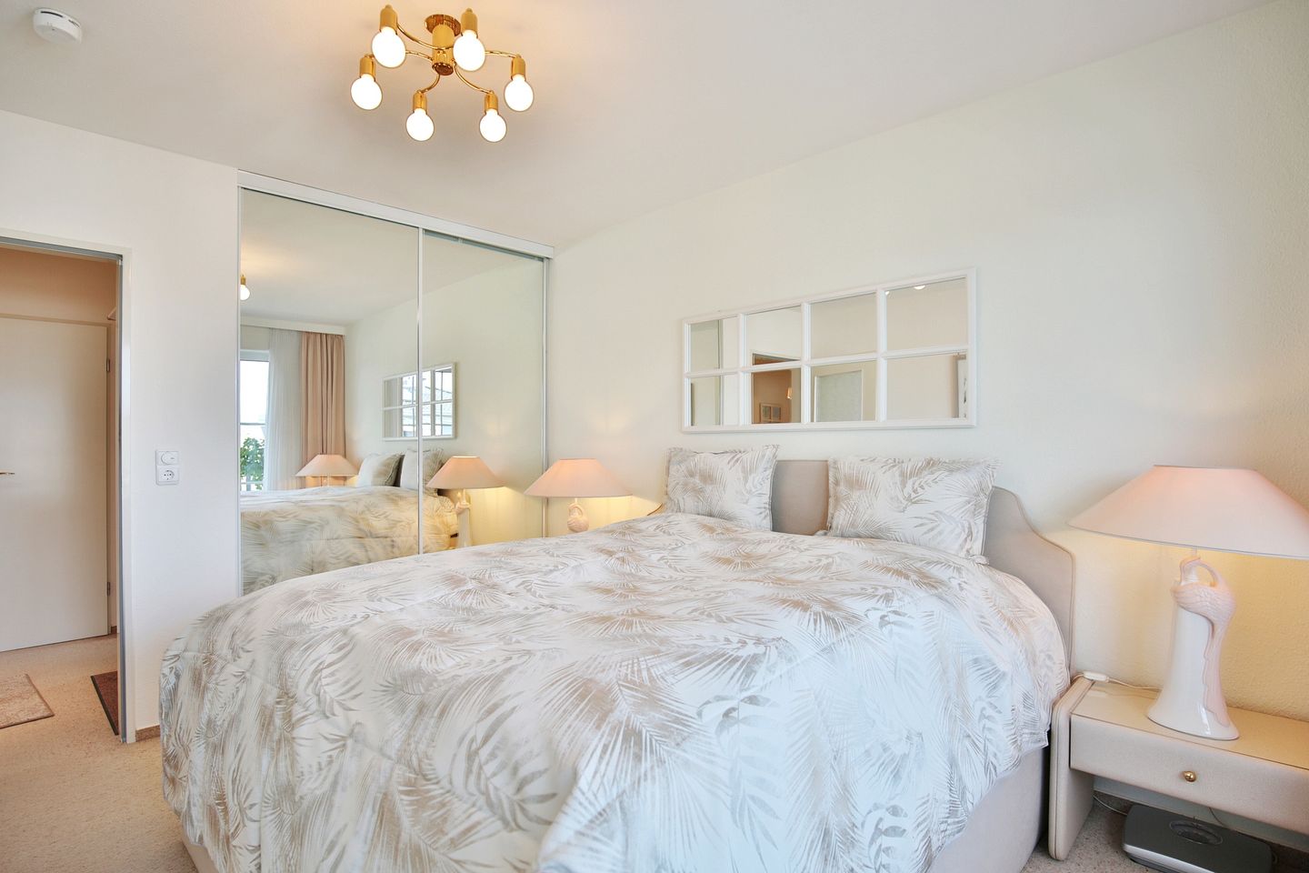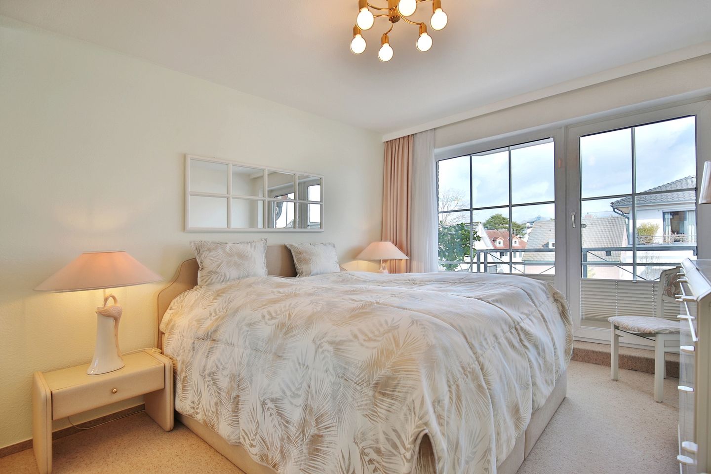 Das separate Schlafzimmer ist mit einem Doppelbett (2x90x200cm), einem eingebauten Kleiderschrank mit Ganzkörperspiegel und einer Kommode ausgestattet und bietet ausreichend Stauraum. Vom Schlafzimmer aus haben Sie Zugang zu einem weiteren Balkon.