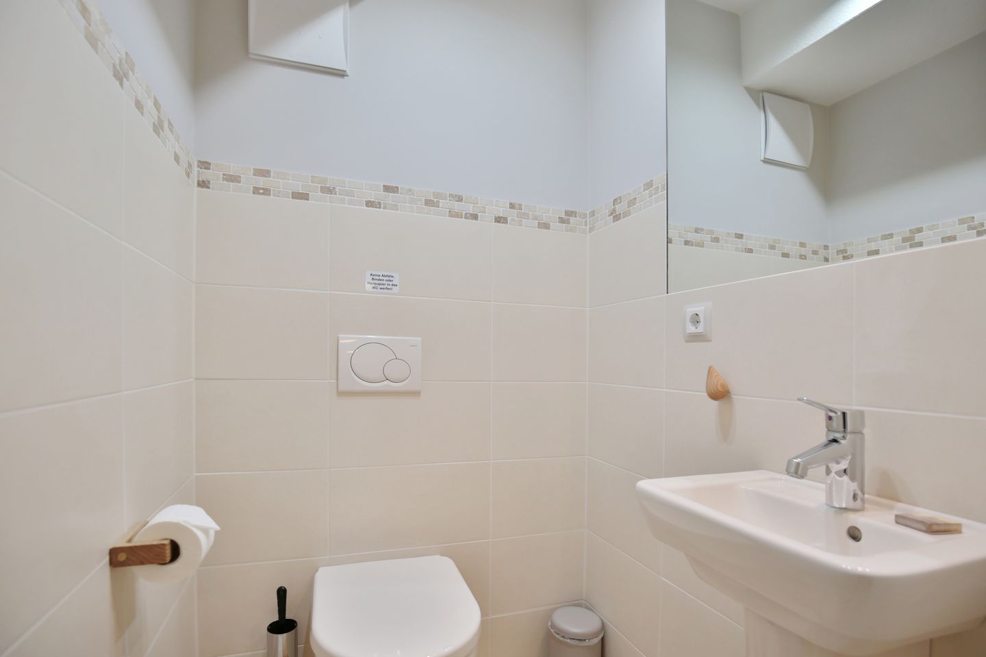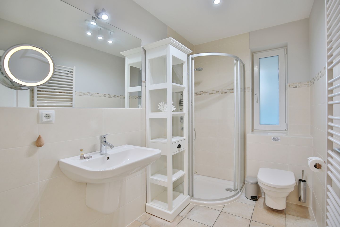 Das Bad bietet Ihnen eine moderne Runddusche, WC und mit genügend Stauraum für Ihre Kosmetika. Ein weiteres separates Gäste-WC finden Sie im Eingangsbereich.