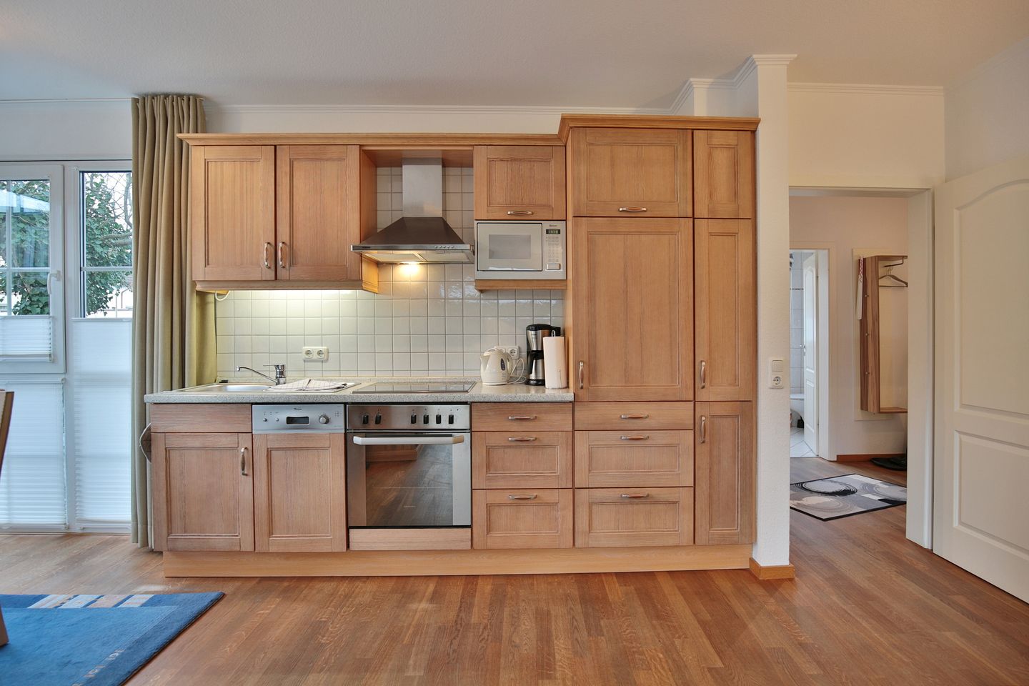 Der Wohnbereich ist offen gestaltet, sodass ein harmonischer Übergang zwischen Wohnzimmer und der offenen Wohnküche entsteht. Diese verfügt über einen Ceranherd, einen Backofen, eine Spülmaschine, eine Mikrowelle, Kaffeemaschine sowie Wasserkocher und Toaster. Selbstverständlich sind alle nötigen Küchenutensilien, Geschirr und Besteck vorhanden, um einen angenehmen Aufenthalt zu gewährleisten.