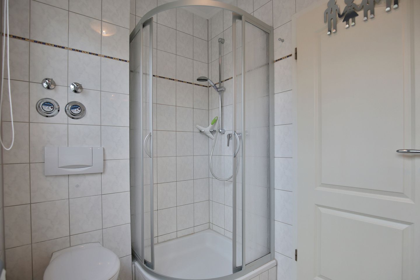Das Badezimmer sorgt mit einer Dusche (mit Einstieg), Waschbecken, WC, Fenster mit Tageslicht sowie einen Haartrockner und einem Spiegelschrank für zusätzlichen Komfort.