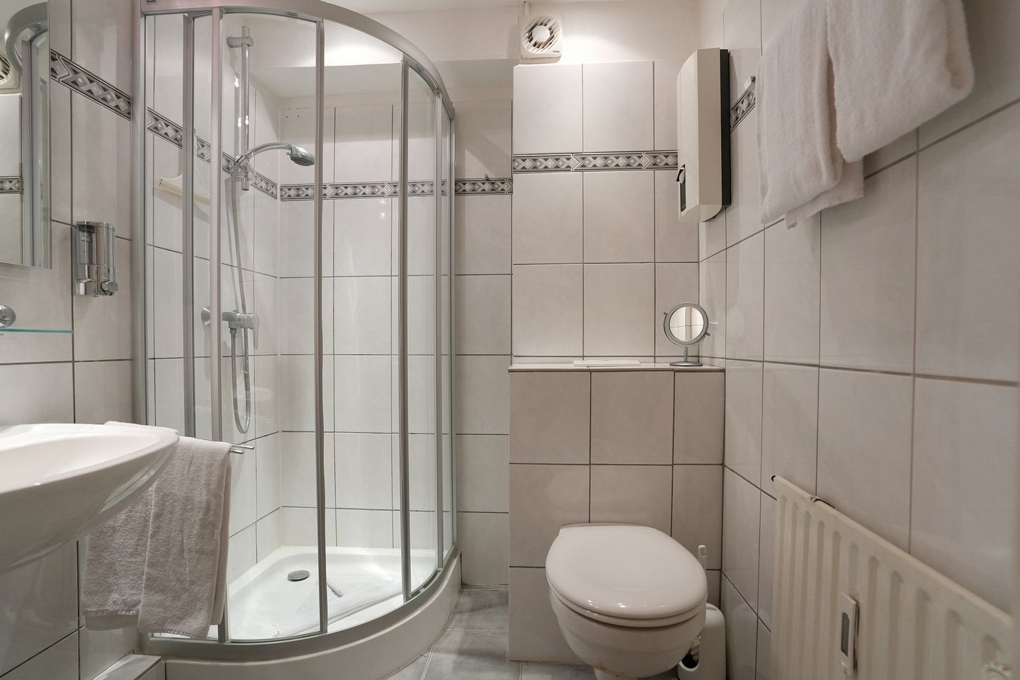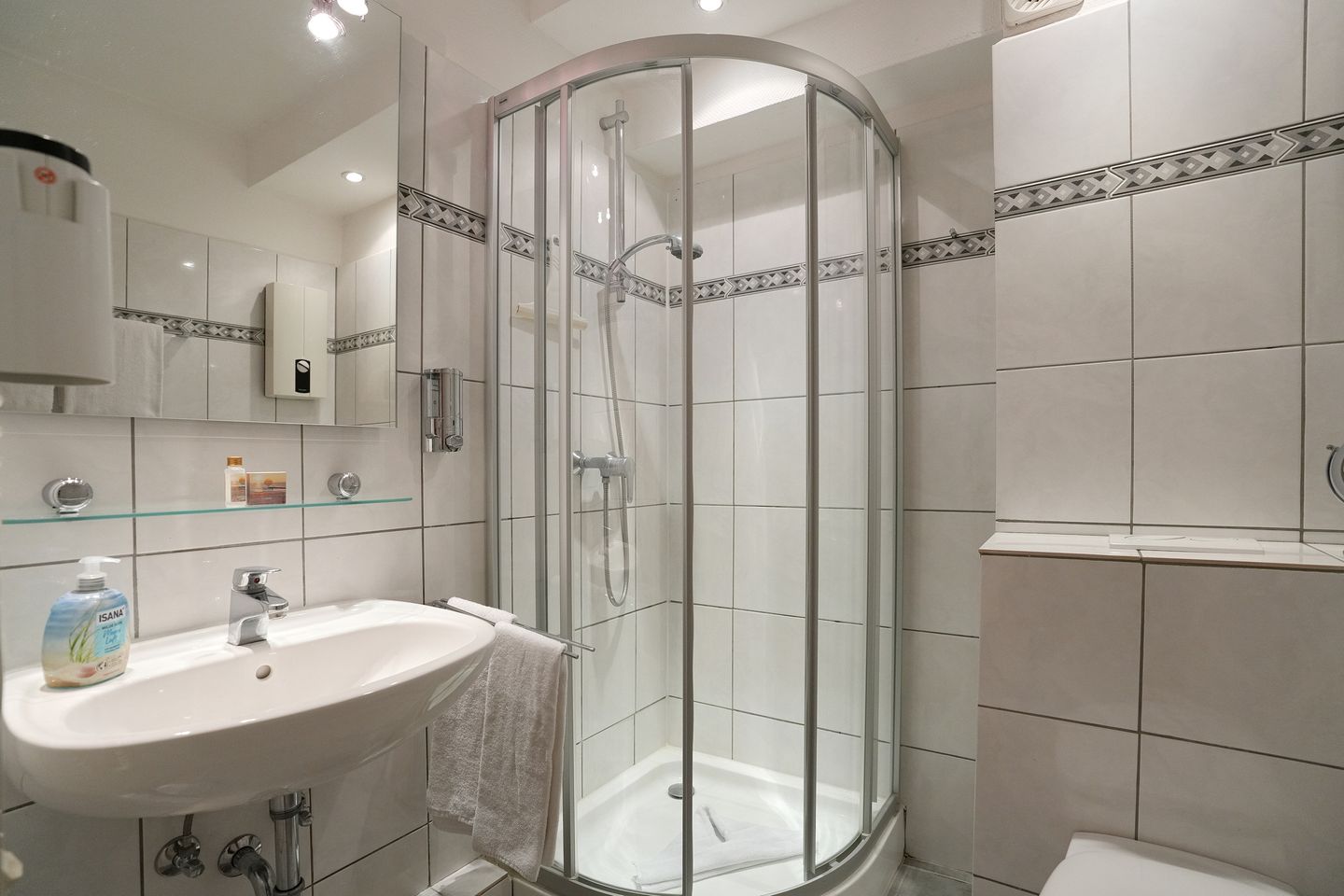 Das Badezimmer ist mit Dusche, WC, Waschbecken und Spiegel ausgestattet.